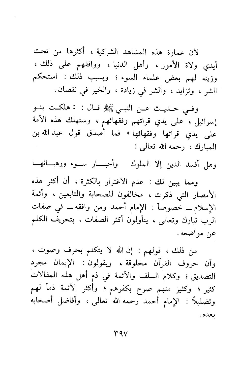 ومما يبين لك عدم الاغترار بالكثرة، أن أكثر هذه الأمصار التي ذكرت، مخالفون للصحابة والتابعين، وأئمة الإسلام - خصوصا الإمام أحمد ومن وافقه - في صفات الرب تبارك وتعالى، يتأولون أكثر الصفات، بتحريف الكلم عن مواضعه.