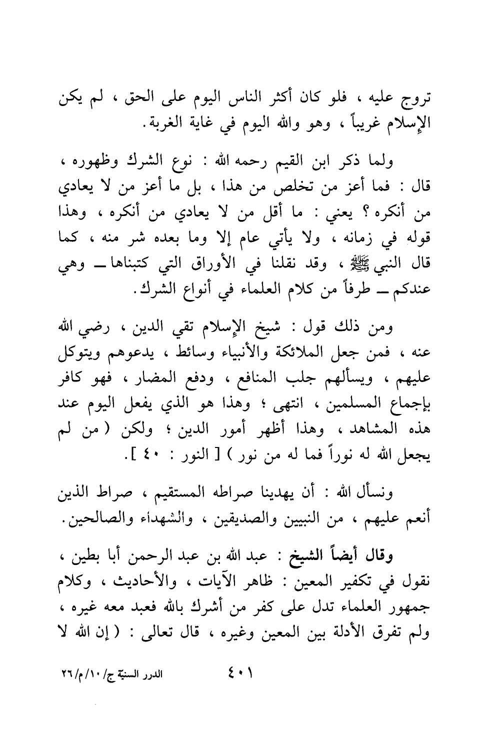 ولما ذكر ابن القيم رحمه الله نوع الشرك وظهوره، قال: فما أعز من تخلص من هذا، بل ما أعز من لا يعادي من أنكره؟! يعني: ما أقل من لا يعادي من أنكره! وهذا قوله في زمانه، ولا يأتي عام إلا وما بعده شر منه، كما قال النبي صلى الله عليه وسلم. وقد نقلنا في الأوراق التي كتبناها - وهي عندكم - طرفا من كلام العلماء في أنواع الشرك.
