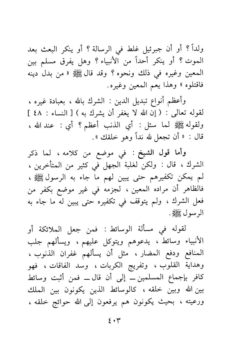 وأما قول الشيخ في موضع من كلامه، لما ذكر الشرك، قال: ولكن لغلبة الجهل في كثير من المتأخرين، لم يمكن تكفيرهم حتى يبين لهم ما جاء به الرسول صلى الله عليه وسلم، فالظاهر أن مراده المعين، لجزمه في غير موضع بكفر من فعل الشرك، ولم يتوقف في تكفيره حتى يبين له ما جاء به الرسول صلى الله عليه وسلم،