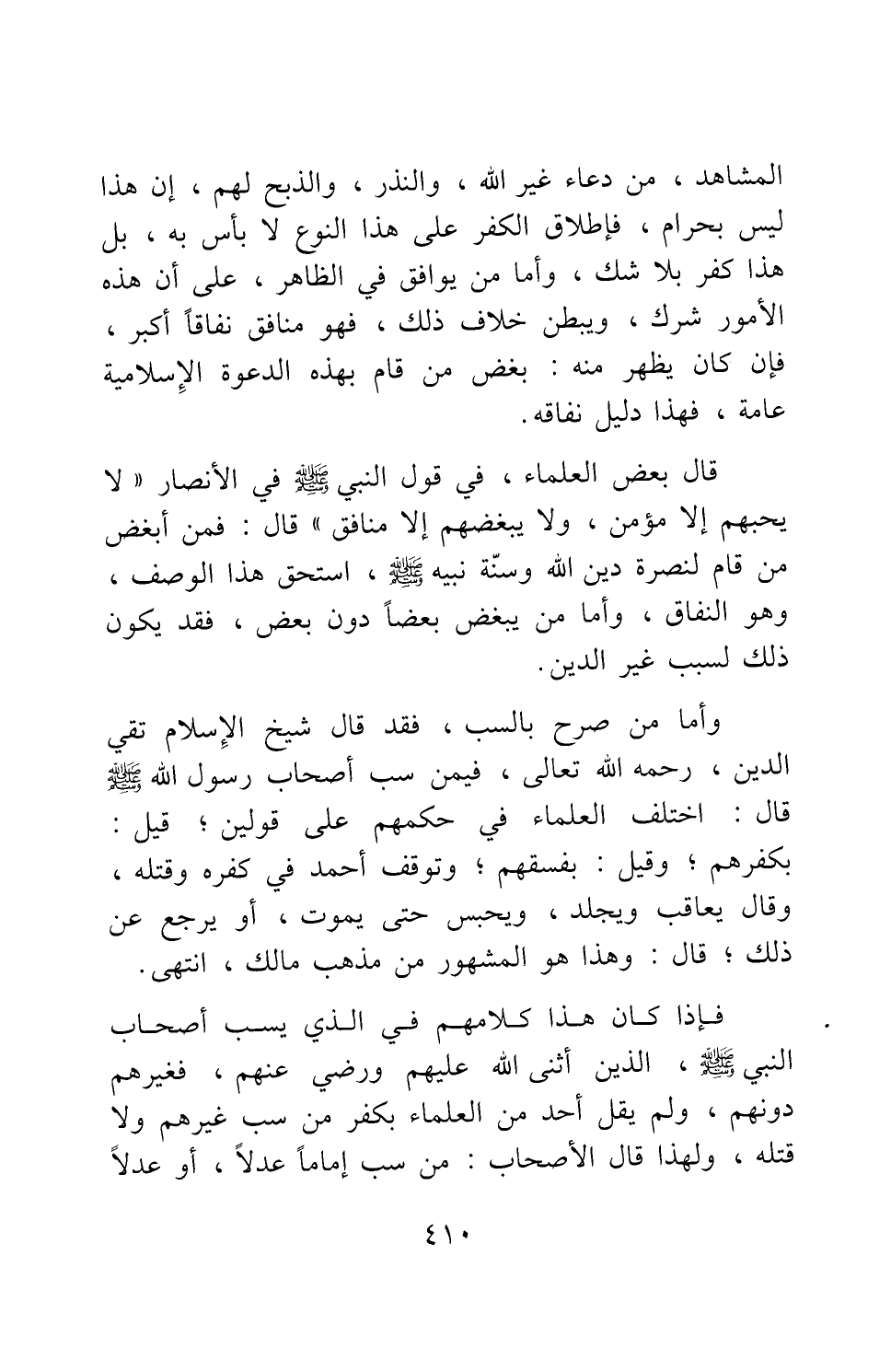 قال بعض العلماء، في قول النبي صلى الله عليه وسلم في الأنصار: " لا يحبهم إلا مؤمن، ولا يبغضهم إلا منافق " 1، قال: فمن أبغض من قام لنصرة دين الله وسنّة نبيه صلى الله عليه وسلم استحق هذا الوصف، وهو النفاق، وأما من يبغض بعضا دون بعض، فقد يكون ذلك لسبب غير الدين.