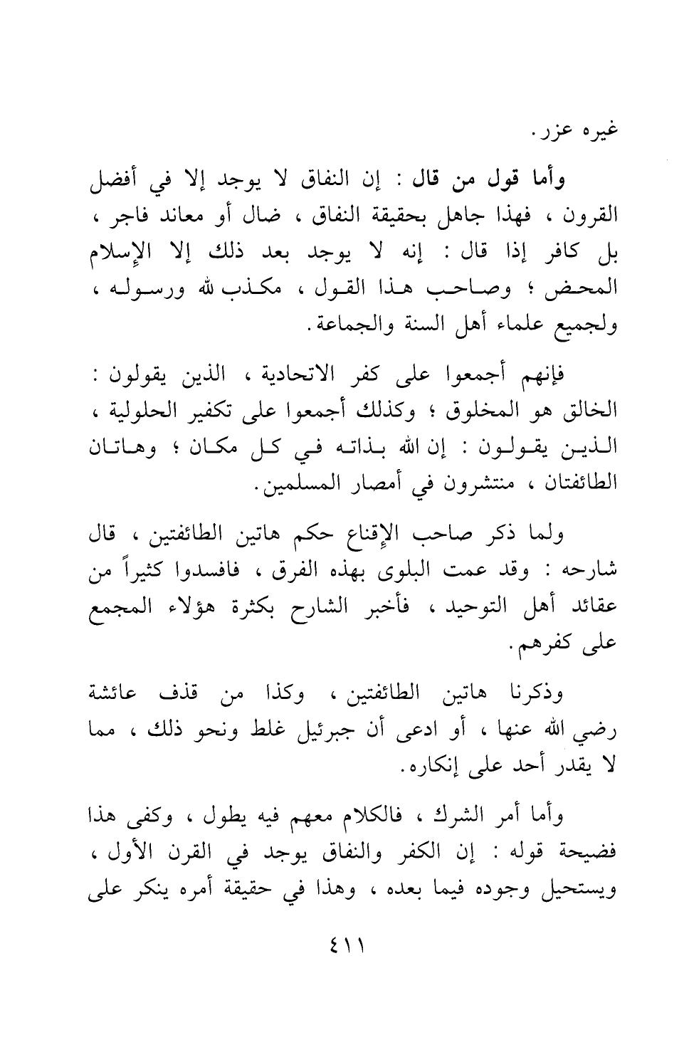 وأما قول من قال: إن النفاق لا يوجد إلا في أفضل القرون، فهذا جاهل بحقيقة النفاق، ضال أو معاند فاجر، بل كافر إذا قال: إنه لا يوجد بعد ذلك إلا الإسلام المحض; وصاحب هذا القول مكذب لله ورسوله، ولجميع علماء أهل السنة والجماعة. فإنهم أجمعوا على كفر الاتحادية، الذين يقولون: الخالق هو المخلوق; وكذلك أجمعوا على تكفير الحلولية، الذين يقولون: إن الله بذاته في كل مكان; وهاتان الطائفتان، منتشرون في أمصار المسلمين.