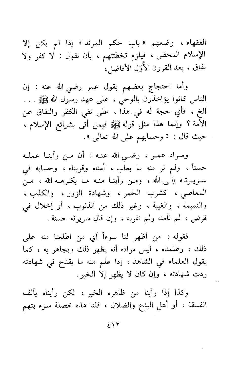 وأما احتجاج بعضهم بقول عمر رضي الله عنه:"إن الناس كانوا يؤاخذون بالوحي على عهد رسول الله صلى الله عليه وسلم" ... إلخ، فأي حجة له في هذا، على نفي الكفر والنفاق عن الأمة؟ وإنما هذا مثل قوله صلى الله عليه وسلم فيمن أتى بشرائع الإسلام، حيث قال: " وحسابهم على الله تعالى " 1.