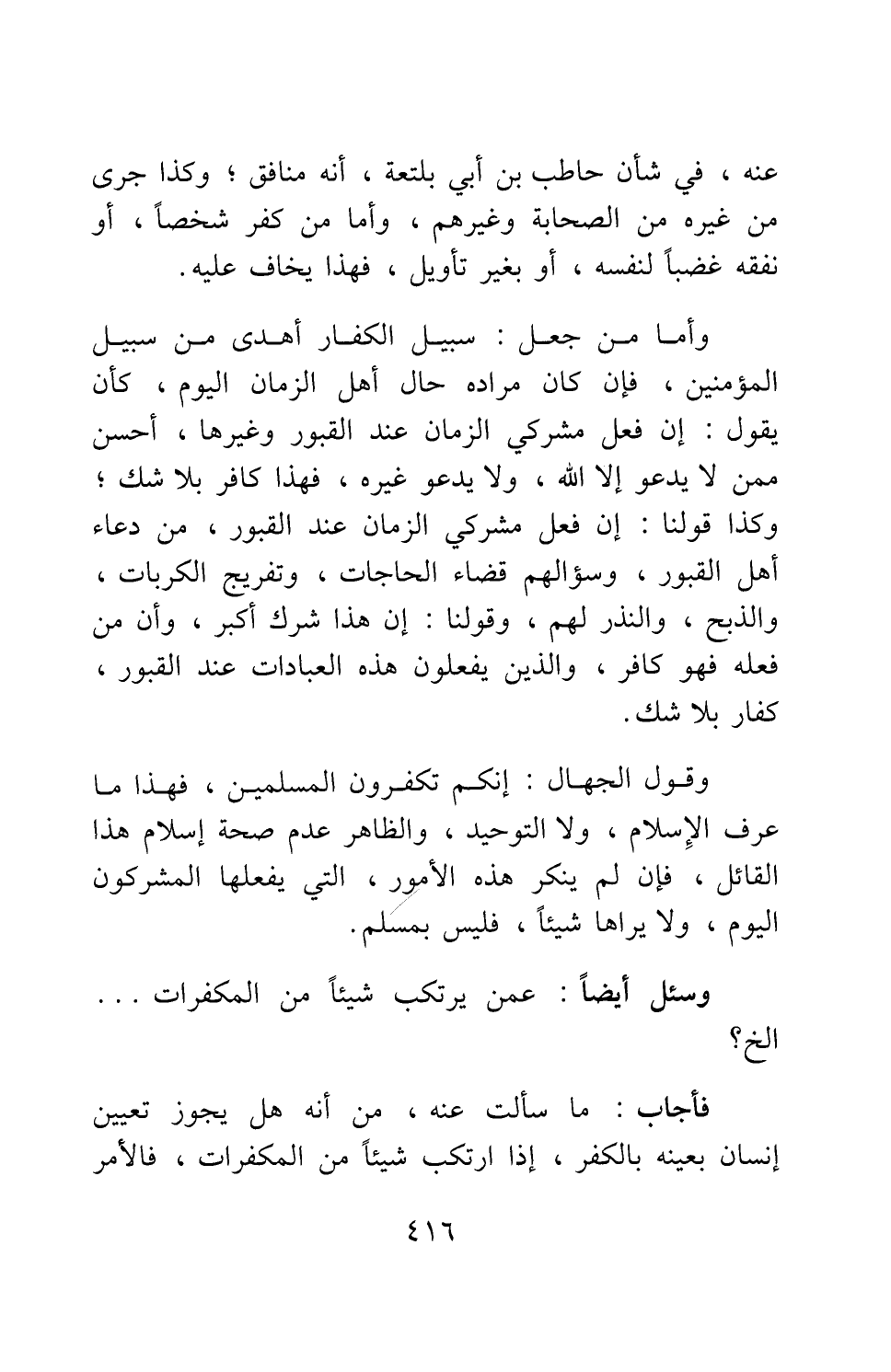 وأما من جعل سبيل الكفار أهدى من سبيل المؤمنين، فإن كان مراده حال أهل الزمان اليوم، كأن يقول: إن فعل مشركي الزمان عند القبور وغيرها، أحسن ممن لا يدعو إلا الله، ولا يدعو غيره، فهذا كافر بلا شك; وكذا قولنا: إن فعل مشركي الزمان عند القبور، من دعاء أهل القبور، وسؤالهم قضاء الحاجات، وتفريج الكربات، والذبح، والنذر لهم، وقولنا: إن هذا شرك أكبر، وأن من فعله فهو كافر، والذين يفعلون هذه العبادات عند القبور، كفار بلا شك.