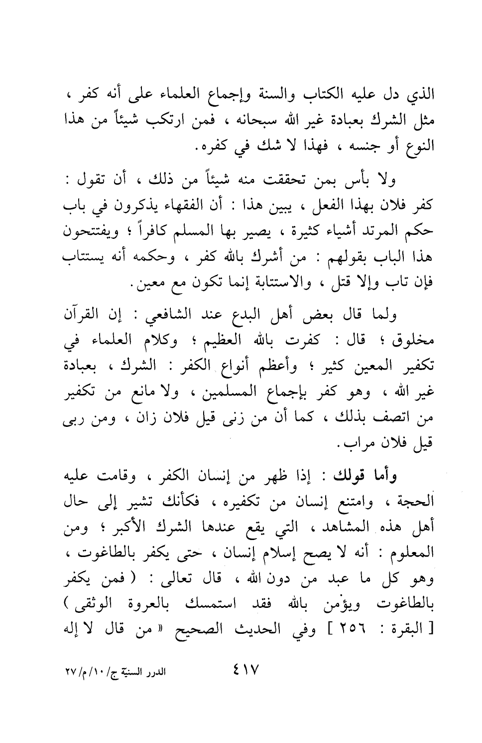 وأما قولك: إذا ظهر من إنسان الكفر، وقامت عليه الحجة، وامتنع إنسان من تكفيره، فكأنك تشير إلى حال أهل هذه المشاهد، التي يقع عندها الشرك الأكبر; ومن المعلوم: أنه لا يصح إسلام إنسان، حتى يكفر بالطاغوت، وهو كل ما عبد من دون الله، قال تعالى: {فَمَنْ يَكْفُرْ بِالطَّاغُوتِ وَيُؤْمِنْ بِاللَّهِ فَقَدِ اسْتَمْسَكَ بِالْعُرْوَةِ الْوُثْقَى} 1. وفي الحديث الصحيح: " من قال لا إله