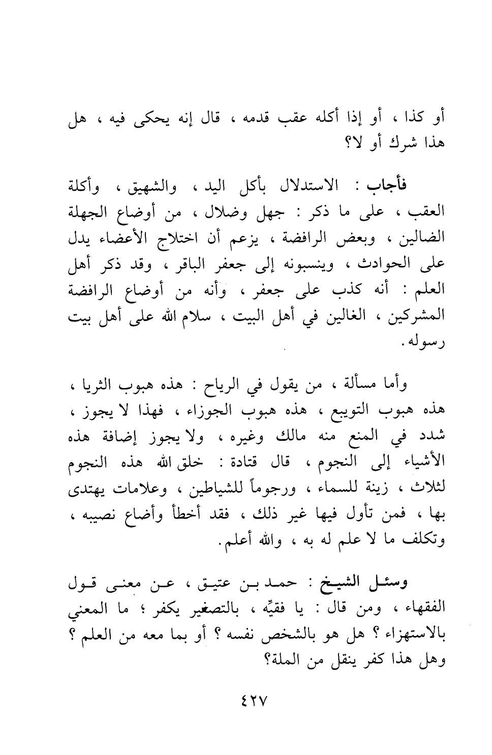 فأجاب: الاستدلال بأكل اليد، والشهيق، وأكلة العقب، على ما ذكر: جهل وضلال، من أوضاع الجهلة الضالين؛ وبعض الرافضة، يزعم أن اختلاج الأعضاء يدل على الحوادث، وينسبونه إلى جعفر الباقر، وقد ذكر أهل العلم: أنه كذب على جعفر، وأنه من أوضاع الرافضة المشركين، الغالين في أهل البيت، سلام الله على أهل بيت رسوله.