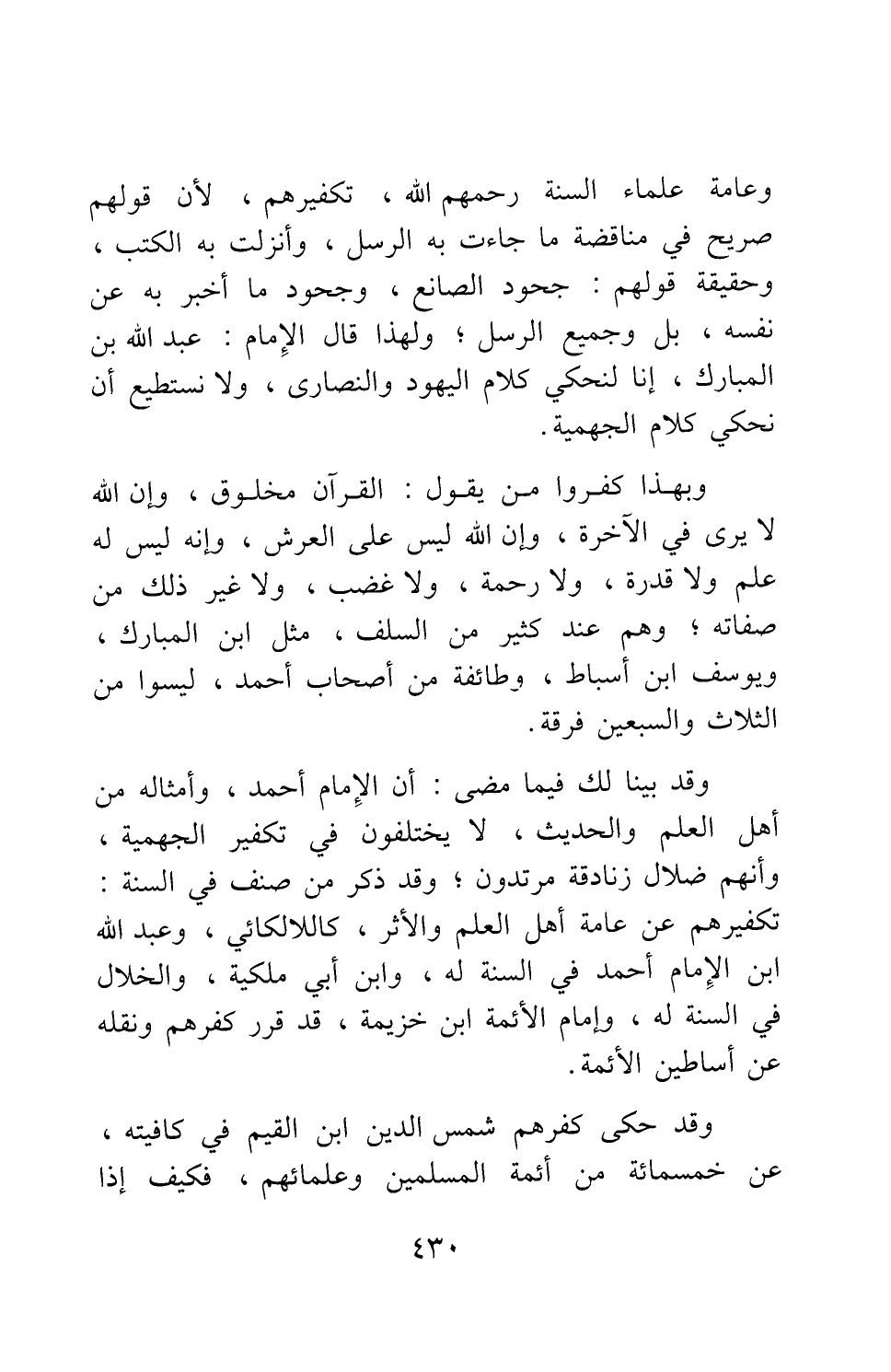وبهذا كفروا من يقول: القرآن مخلوق، وإن الله لا يرى في الآخرة، وإن الله ليس على العرش، وإنه ليس له علم ولا قدرة، ولا رحمة، ولا غضب، ولا غير ذلك من صفاته; وهم عند كثير من السلف مثل ابن المبارك، ويوسف ابن أسباط، وطائفة من أصحاب أحمد، ليسوا من الثلاث والسبعين فرقة.
