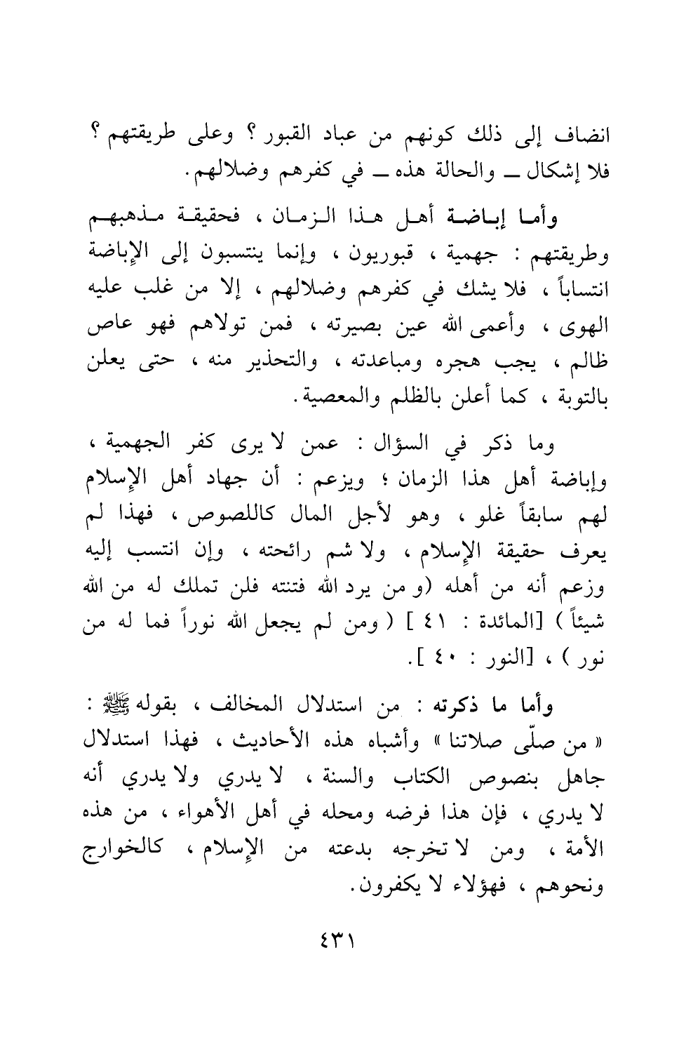 وأما ما ذكرته: من استدلال المخالف، بقوله صلى الله عليه وسلم: "من صلى صلاتنا " 3 وأشباه هذه الأحاديث، فهذا استدلال جاهل بنصوص الكتاب والسنة، لا يدري، ولا يدري أنه لا يدري، فإن هذا فرضه ومحله في أهل الأهواء، من هذه الأمة؛ ومن لا تخرجه بدعته من الإسلام، كالخوارج ونحوهم، فهؤلاء لا يكفرون،