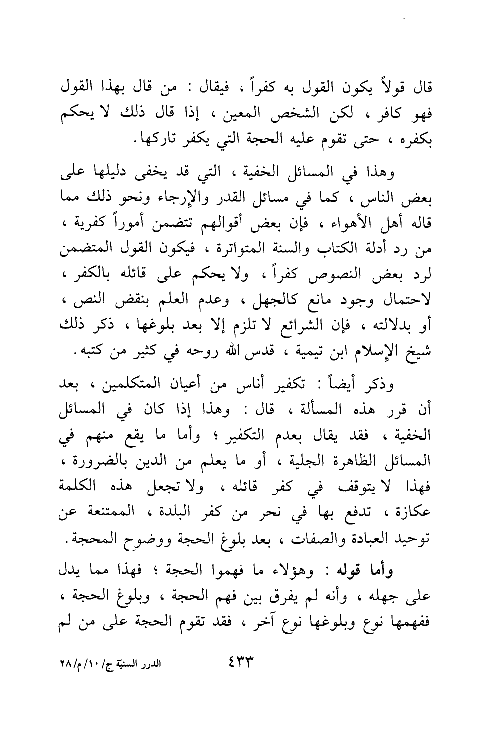 وهذا في المسائل الخفية، التي قد يخفى دليلها على بعض الناس، كما في مسائل القدر والإرجاء ونحو ذلك مما قاله أهل الأهواء، فإن بعض أقوالهم تتضمن أمورا كفرية، من رد أدلة الكتاب والسنة المتواترة، فيكون القول المتضمن لرد بعض النصوص كفرا، ولا يحكم على قائله بالكفر، لاحتمال وجود مانع كالجهل، وعدم العلم بنقض النص، أو بدلالته، فإن الشرائع لا تلزم إلا بعد بلوغها؛ ذكر ذلك شيخ الإسلام ابن تيمية، قدس الله روحه في كثير من كتبه.