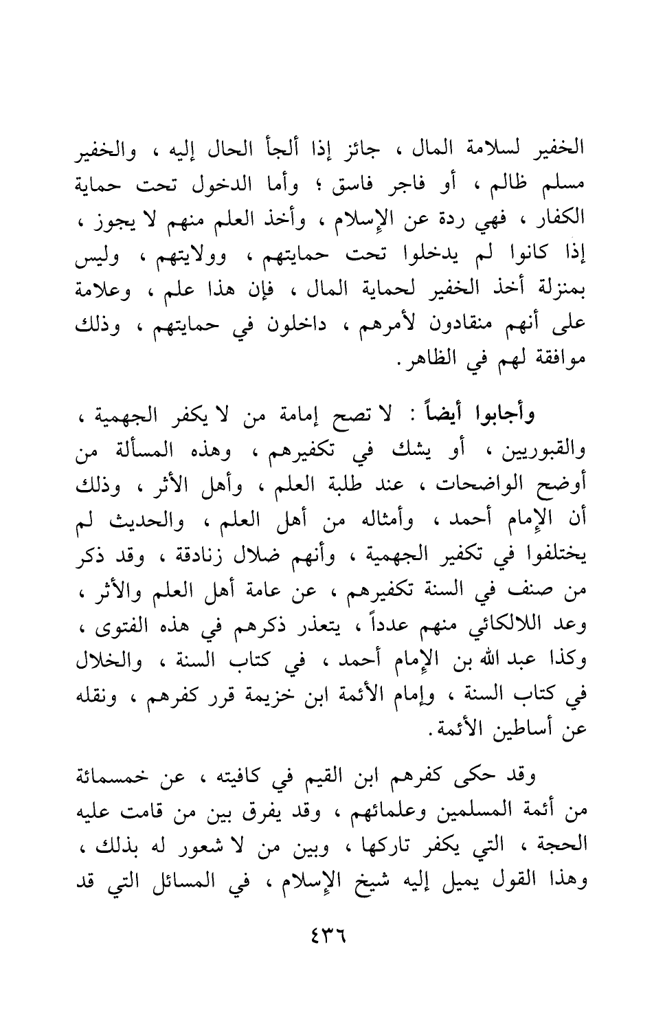 وأجابوا أيضا: لا تصح إمامة من لا يكفر الجهمية، والقبوريين، أو يشك في تكفيرهم؛ وهذه المسألة من أوضح الواضحات عند طلبة العلم وأهل الأثر، وذلك أن الإمام أحمد وأمثاله من أهل العلم والحديث، لم يختلفوا في تكفير الجهمية، وأنهم ضلال زنادقة. وقد ذكر من صنف في السنة تكفيرهم، عن عامة أهل العلم والأثر؛ وعد اللالكائي منهم عددا يتعذر ذكرهم في هذه الفتوى، وكذا عبد الله بن الإمام أحمد، في كتاب السنة، والخلال في كتاب السنة، وإمام الأئمة ابن خزيمة قرر كفرهم، ونقله عن أساطين الأئمة.