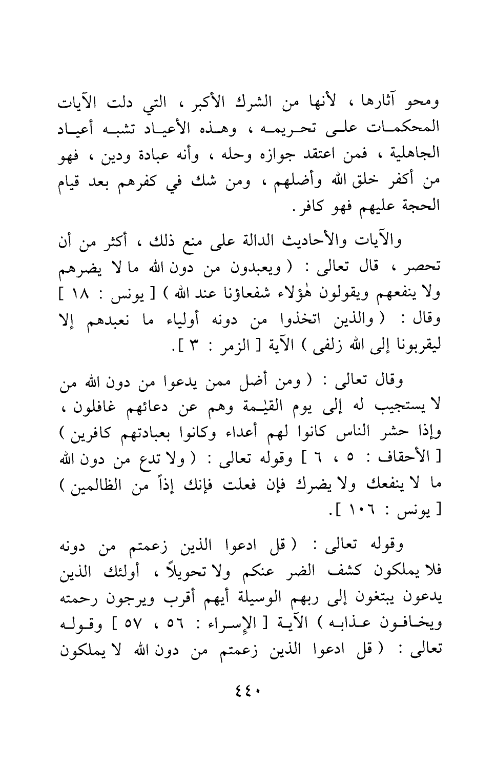 ومحو آثارها، لأنها من الشرك الأكبر، الذي دلت الآيات المحكمات على تحريمه؛ وهذه الأعياد تشبه أعياد الجاهلية، فمن اعتقد جوازه وحله، وأنه عبادة ودين، فهو من أكفر خلق الله وأضلهم، ومن شك في كفرهم بعد قيام الحجة عليهم فهو كافر.