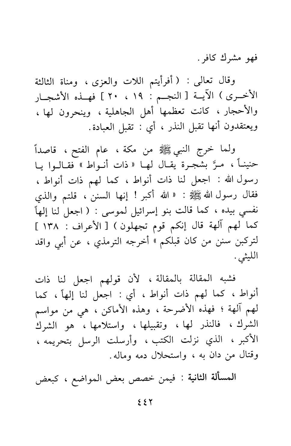 فشبه المقالة بالمقالة، لأن قولهم اجعل لنا ذات أنواط، كما لهم ذات أنواط، أي: اجعل لنا إلها، كما لهم آلهة; فهذه الأضرحة، وهذه الأماكن، هي من مواسم الشرك؛ فالنذر لها، وتقبيلها، واستلامها، هو الشرك الأكبر، الذي نزلت الكتب، وأرسلت الرسل بتحريمه، وقتال من دان به، واستحلال دمه وماله.