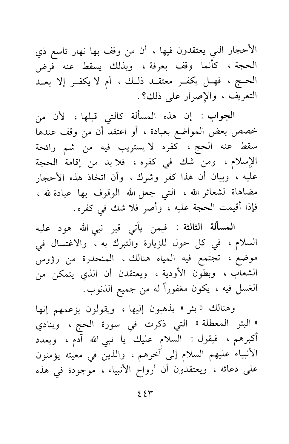 الأحجار التي يعتقدون فيها، أن من وقف بها نهار تاسع ذي الحجة، كأنما وقف بعرفة، وبذلك يسقط عنه فرض الحج، فهل يكفر معتقد ذلك، أم لا يكفر إلا بعد التعريف، والإصرار على ذلك؟