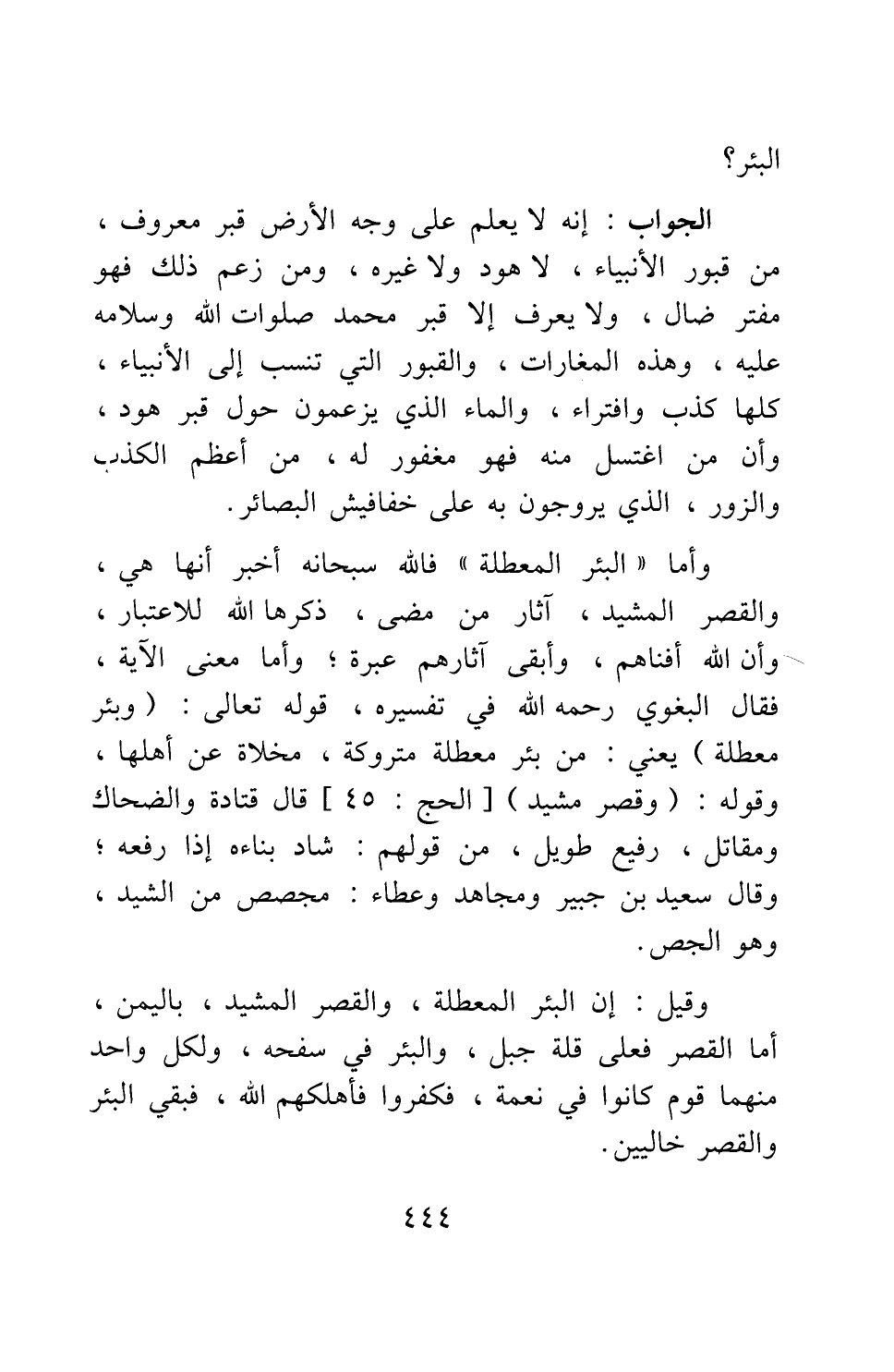 وأما "البئر المعطلة" فالله سبحانه أخبر أنها هي والقصر المشيد آثار من مضى، ذكرها الله للاعتبار، وأن الله أفناهم، وأبقى آثارهم عبرة؛ وأما معنى الآية، فقال البغوي رحمه الله في تفسيره: قوله تعالى: {وَبِئْرٍ مُعَطَّلَةٍ} 1 يعني: من بئر معطلة متروكة، مخلاة عن أهلها، وقوله: {وَقَصْرٍ مَشِيدٍ} 2: قال قتادة والضحاك ومقاتل: رفيع طويل، من قولهم: شاد بناءه إذا رفعه; وقال سعيد بن جبير ومجاهد وعطاء: مجصص من الشيد، وهو الجص.