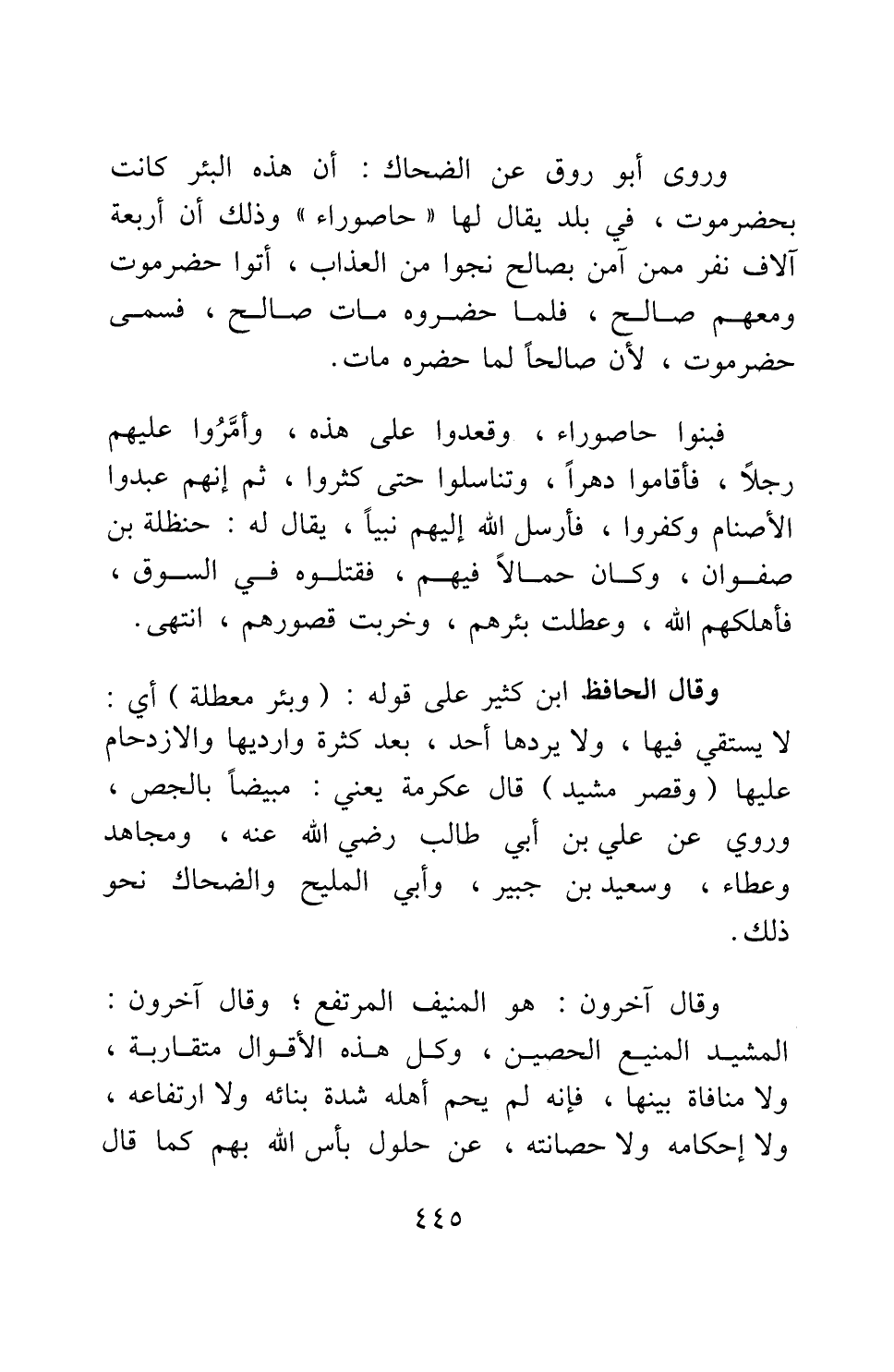 وروى أبو روق عن الضحاك: أن هذه البئر كانت بحضرموت، في بلد يقال لها "حاصوراء"، وذلك أن أربعة آلاف نفر ممن آمن بصالح نجوا من العذاب، أتوا حضرموت ومعهم صالح، فلما حضروه مات صالح، فسمي حضرموت، لأن صالحا لما حضره مات.