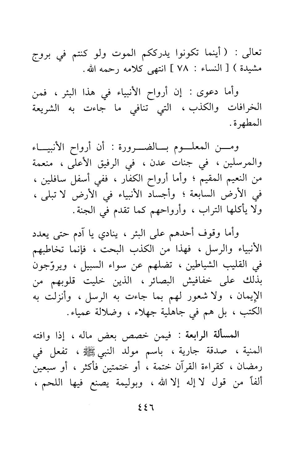 وأما دعوى: إن أرواح الأنبياء في هذا البئر، فمن الخرافات والكذب، التي تنافي ما جاءت به الشريعة المطهرة. ومن المعلوم بالضرورة: أن أرواح الأنبياء والمرسلين في جنات عدن في الرفيق الأعلى، منعمة من النعيم المقيم; وأما أرواح الكفار، ففي أسفل سافلين، في الأرض السابعة; وأجساد الأنبياء في الأرض لا تبلى، ولا يأكلها التراب، وأرواحهم كما تقدم في الجنة.