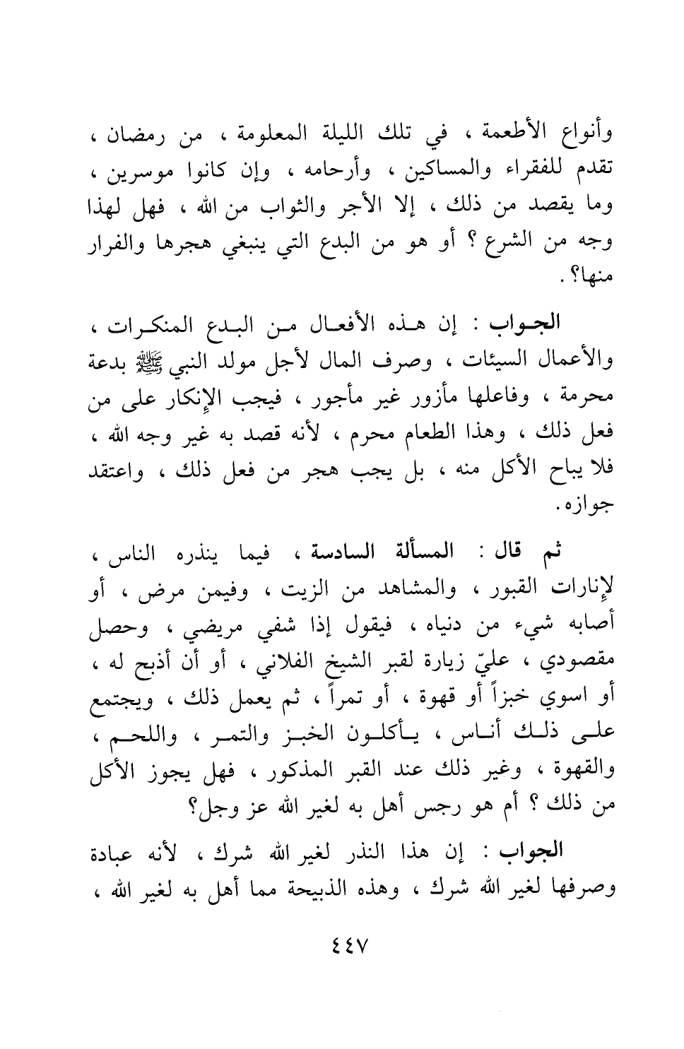 المسألة السادسة: فيما ينذره الناس، لإنارات القبور، والمشاهد من الزيت، وفيمن مرض، أو أصابه شيء من دنياه، فيقول إذا شفي مريضي، وحصل مقصودي، عليّ زيارة لقبر الشيخ الفلاني، أو أن أذبح له، أو أسوي خبزا أو قهوة، أو تمرا، ثم يعمل ذلك، ويجتمع على ذلك أناس، يأكلون الخبز والتمر، واللحم، والقهوة، وغير ذلك عند القبر المذكور، فهل يجوز الأكل من ذلك؟ أم هو رجس أهلّ به لغير الله عز وجل؟