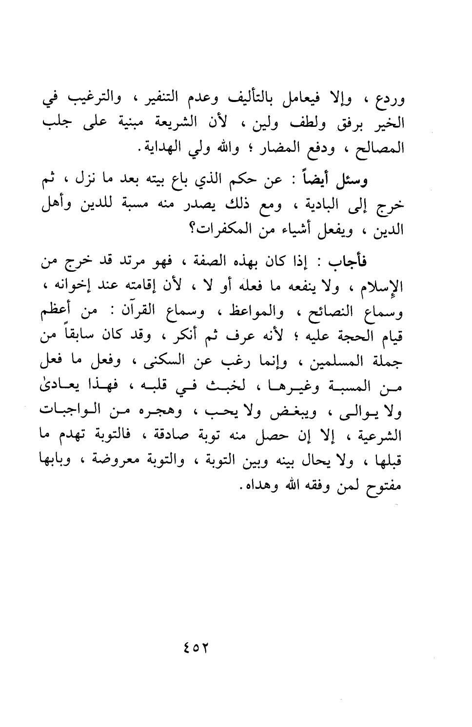 وسئل أيضا: عن حكم الذي باع بيته بعد ما نزل، ثم خرج إلى البادية، ومع ذلك يصدر منه مسبة للدين وأهل الدين ويفعل أشياء من المكفرات؟