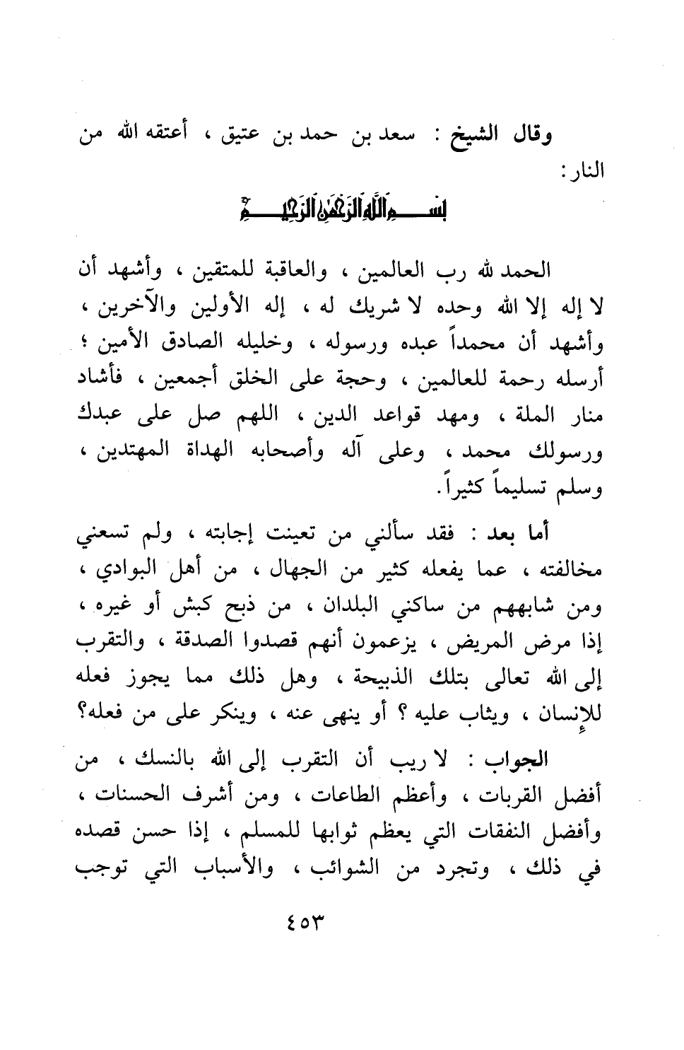 وقال الشيخ: سعد بن حمد بن عتيق، أعتقه الله من النار:
