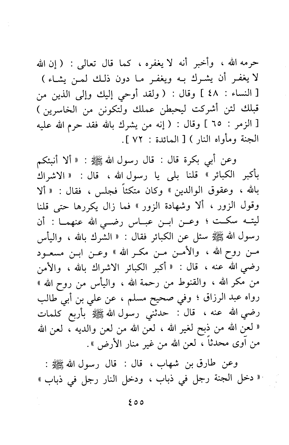 وعن أبي بكرة قال: قال رسول الله صلى الله عليه وسلم: "ألا أنبئكم بأكبر الكبائر؟ قلنا: بلى يا رسول الله، قال: الإشراك بالله، وعقوق الوالدين وكان متكئا فجلس، فقال: ألا وقول الزور، ألا وشهادة الزور. فما زال يكررها حتى قلنا ليته سكت " 4 وعن ابن عباس رضي الله عنهما: أن رسول الله صلى الله عليه وسلم سئل عن الكبائر فقال:?"الشرك بالله، واليأس من روح الله، والأمن من مكر الله" وعن ابن مسعود رضي الله عنه قال: "أكبر الكبائر: الإشراك بالله، والأمن من مكر الله، والقنوط من رحمة الله، واليأس من روح الله" رواه عبد الرزاق; وفي صحيح مسلم، عن علي بن أبي طالب رضي الله عنه قال: حدثني رسول الله صلى الله عليه وسلم بأربع كلمات: " لعن الله من ذبح لغير الله، لعن الله من لعن والديه، لعن الله من آوى محدثا، لعن الله من غير منار الأرض " 5.