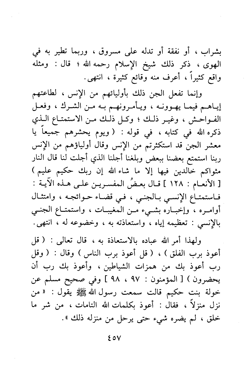 ولهذا أمر الله عباده بالاستعاذة به، قال تعالى: {قُلْ أَعُوذُ بِرَبِّ الْفَلَقِ} 2، {قُلْ أَعُوذُ بِرَبِّ النَّاسِ} 3، وقال: {وَقُلْ رَبِّ أَعُوذُ بِكَ مِنْ هَمَزَاتِ الشَّيَاطِينِ وَأَعُوذُ بِكَ رَبِّ أَنْ يَحْضُرُونِ} 4. وفي صحيح مسلم عن خولة بنت حكيم قالت سمعت رسول الله صلى الله عليه وسلم يقول: " من نزل منْزلا، فقال: أعوذ بكلمات الله التامات، من شر ما خلق، لم يضره شيء حتى يرحل من منْزله ذلك " 5.