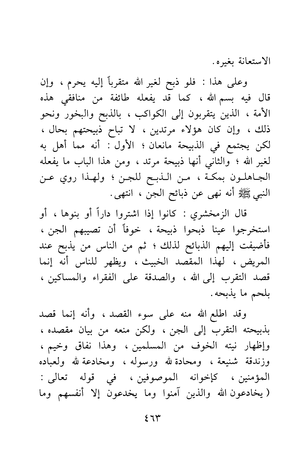 وقد اطلع الله منه على سوء القصد، وأنه إنما قصد بذبيحته التقرب إلى الجن، ولكن منعه من بيان مقصده، وإظهار نيته الخوف من المسلمين؛ وهذا نفاق وخيم، وزندقة شنيعة، ومحادة لله ورسوله، ومخادعة لله ولعباده المؤمنين، كإخوانه الموصوفين في قوله تعالى: {يُخَادِعُونَ اللَّهَ وَالَّذِينَ آمَنُوا وَمَا يَخْدَعُونَ إِلَّا أَنْفُسَهُمْ وَمَا