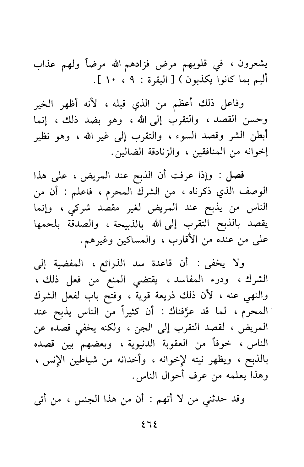 فصل: [الذبح عند المريض لغير مقصد شركي]