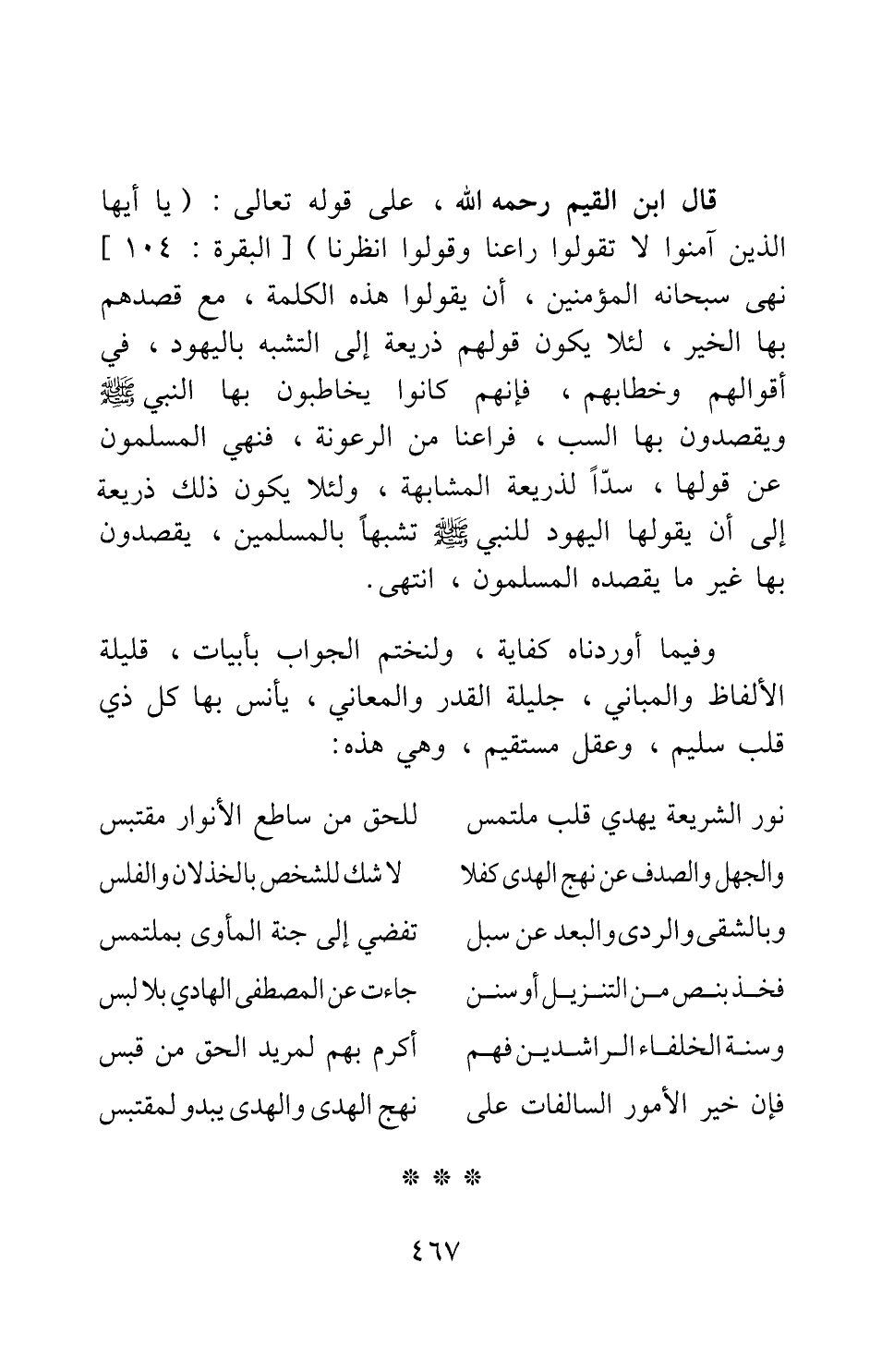 قال ابن القيم رحمه الله، على قوله تعالى: {يَا أَيُّهَا الَّذِينَ آمَنُوا لا تَقُولُوا رَاعِنَا وَقُولُوا انْظُرْنَا} 1: نهى سبحانه المؤمنين، أن يقولوا هذه الكلمة، مع قصدهم بها الخير، لئلا يكون قولهم ذريعة إلى التشبه باليهود، في أقوالهم وخطابهم، فإنهم كانوا يخاطبون بها النبي صلى الله عليه وسلم ويقصدون بها السب؛ فراعنا من الرعونة، فنهي المسلمون عن قولها، سدا لذريعة المشابهة، ولئلا يكون ذلك ذريعة إلى أن يقولها اليهود للنبي صلى الله عليه وسلم تشبها بالمسلمين، يقصدون بها غير ما يقصده المسلمون، انتهى.