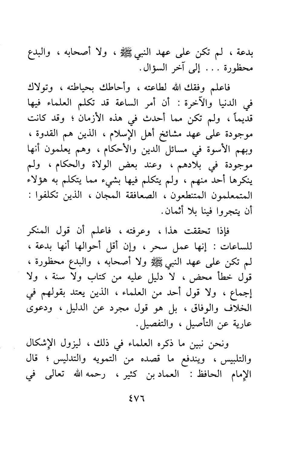 فاعلم وفقك الله لطاعته، وأحاطك بحياطته، وتولاك في الدنيا والآخرة: أن أمر الساعة قد تكلم العلماء فيها قديما، ولم تكن مما أحدث في هذه الأزمان; وقد كانت موجودة على عهد مشايخ أهل الإسلام، الذين هم القدوة، وبهم الأسوة في مسائل الدين والأحكام، وهم يعلمون أنها موجودة في بلادهم، وعند بعض الولاة والحكام، ولم ينكرها أحد منهم، ولم يتكلم فيها بشيء مما يتكلم به هؤلاء المتمعلمون المتنطعون، الصعافقة المجان، الذين تكلفوا أن يتجروا فينا بلا أثمان.