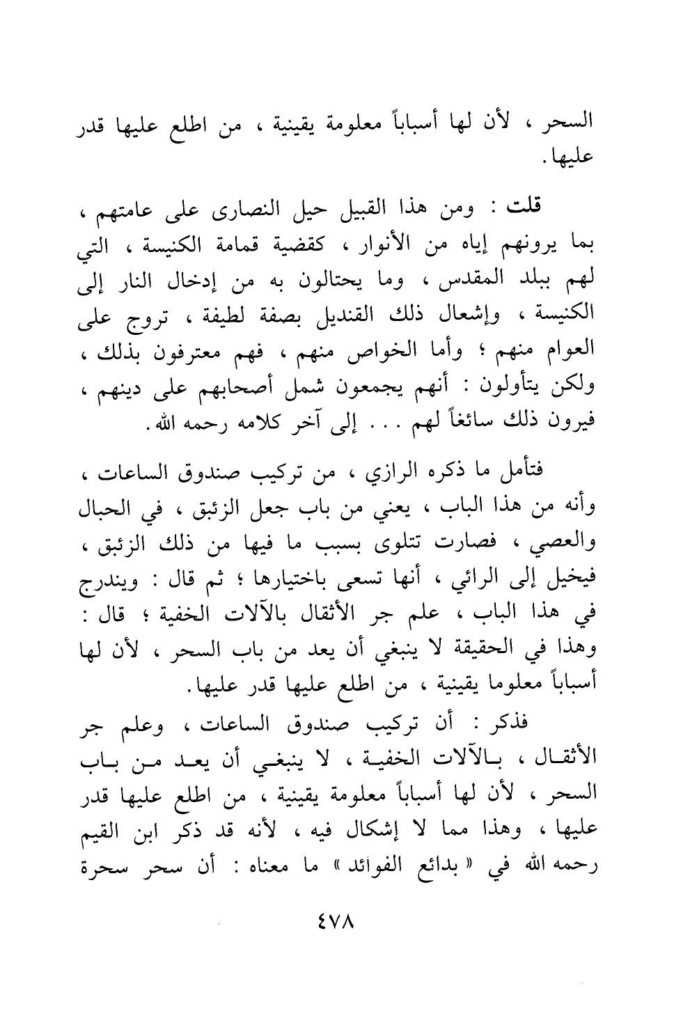 فتأمل ما ذكره الرازي، من تركيب صندوق الساعات، وأنه من هذا الباب، يعني من باب جعل الزئبق في الحبال والعصي، فصارت تتلوى بسبب ما فيها من ذلك الزئبق، فيخيل إلى الرائي أنها تسعى باختيارها; ثم قال: ويندرج في هذا الباب علم جر الأثقال بالآلات الخفية; قال: وهذا في الحقيقة لا ينبغي أن يعد من باب السحر، لأن لها أسبابا معلوما يقينية، من اطلع عليها قدر عليها. فذكر: أن تركيب صندوق الساعات، وعلم جر الأثقال بالآلات الخفية، لا ينبغي أن يعد من باب السحر، لأن لها أسبابا معلومة يقينية، من اطلع عليها قدر عليها، وهذا مما لا إشكال فيه، لأنه قد ذكر ابن القيم رحمه الله في "بدائع الفوائد" ما معناه: أن سحر سحرة