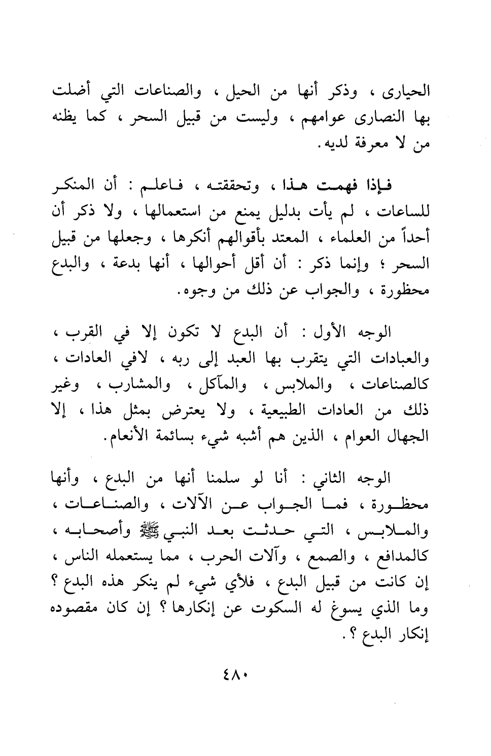 الوجه الثاني: أنا لو سلمنا أنها من البدع، وأنها محظورة، فما الجواب عن الآلات، والصناعات، والملابس، التي حدثت بعد النبي صلى الله عليه وسلم وأصحابه، كالمدافع، والصمع، وآلات الحرب، مما يستعمله الناس، إن كانت من قبيل البدع، فلأي شيء لم ينكر هذه البدع؟ وما الذي يسوغ له السكوت عن إنكارها، إن كان مقصوده إنكار البدع؟