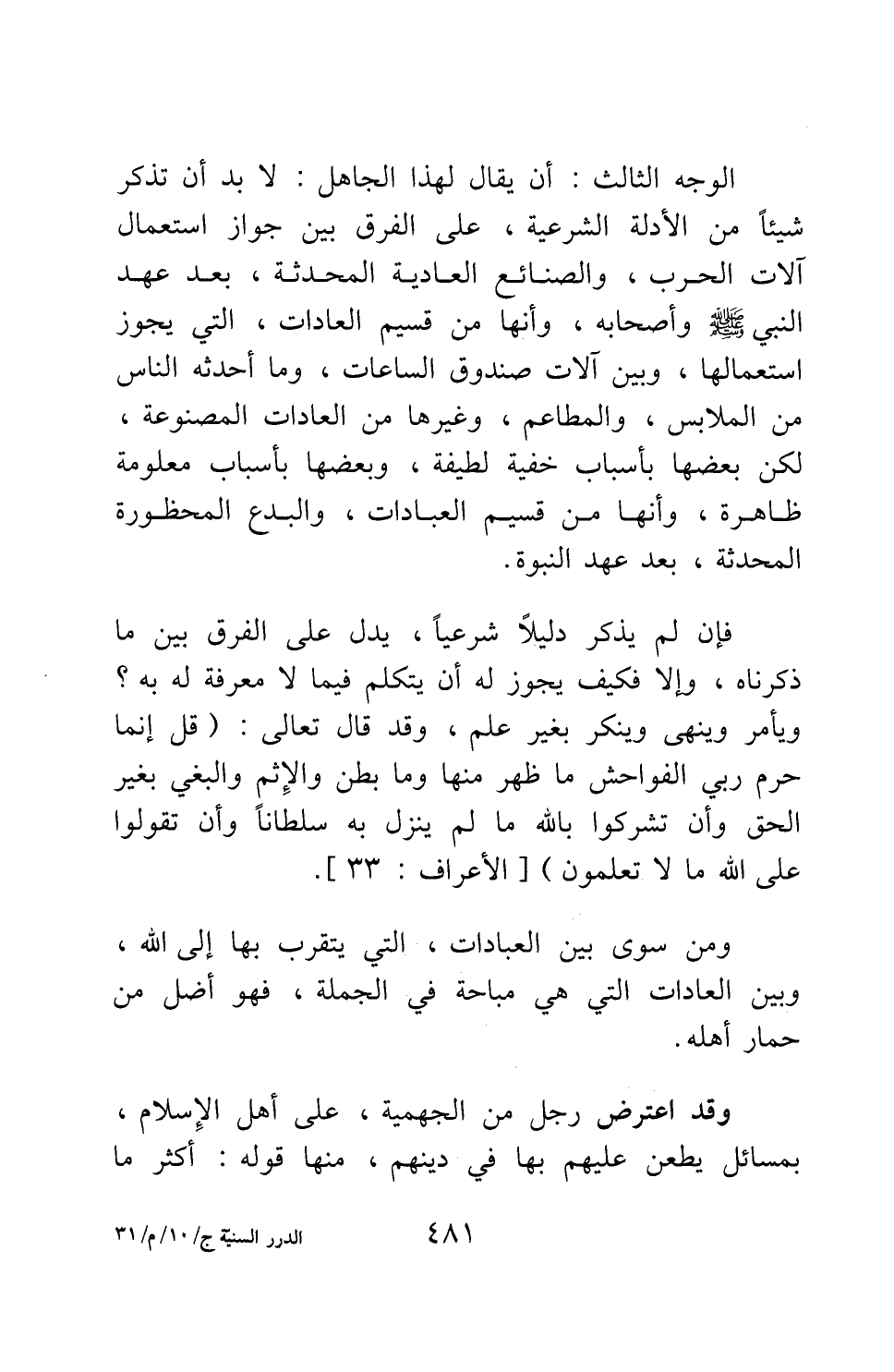الوجه الثالث: أن يقال لهذا الجاهل: لا بد أن تذكر شيئا من الأدلة الشرعية، على الفرق بين جواز استعمال آلات الحرب، والصنائع العادية المحدثة بعد عهد النبي صلى الله عليه وسلم وأصحابه، وأنها من قسيم العادات التي يجوز استعمالها، وبين آلات صندوق الساعات، وما أحدثه الناس من الملابس، والمطاعم، وغيرها من العادات المصنوعة، لكن بعضها بأسباب خفية لطيفة، وبعضها بأسباب معلومة ظاهرة، وأنها من قسيم العبادات، والبدع المحظورة المحدثة، بعد عهد النبوة.
