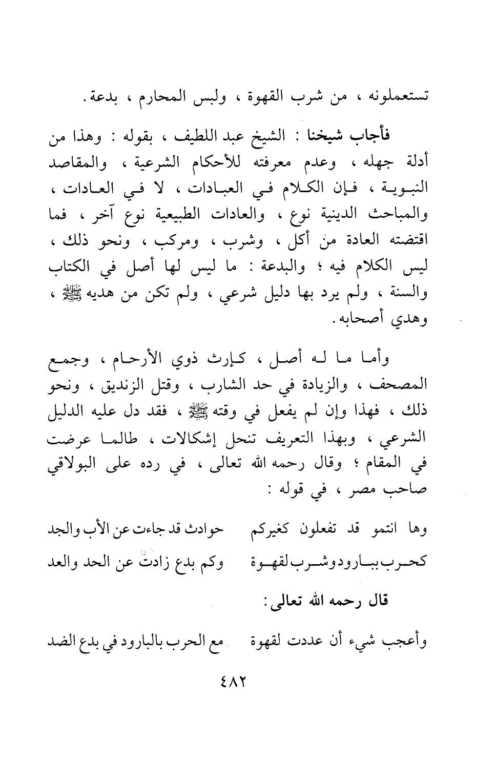 تستعملونه من شرب القهوة، ولبس المحارم، بدعة. فأجاب شيخنا: الشيخ عبد اللطيف، بقوله: وهذا من أدلة جهله، وعدم معرفته للأحكام الشرعية، والمقاصد النبوية؛ فإن الكلام في العبادات، لا في العادات، والمباحث الدينية نوع، والعادات الطبيعية نوع آخر؛ فما اقتضته العادة من أكل، وشرب، ومركب، ونحو ذلك، ليس الكلام فيه; والبدعة: ما ليس لها أصل في الكتاب والسنة، ولم يرد بها دليل شرعي، ولم تكن من هديه صلى الله عليه وسلم وهدي أصحابه.