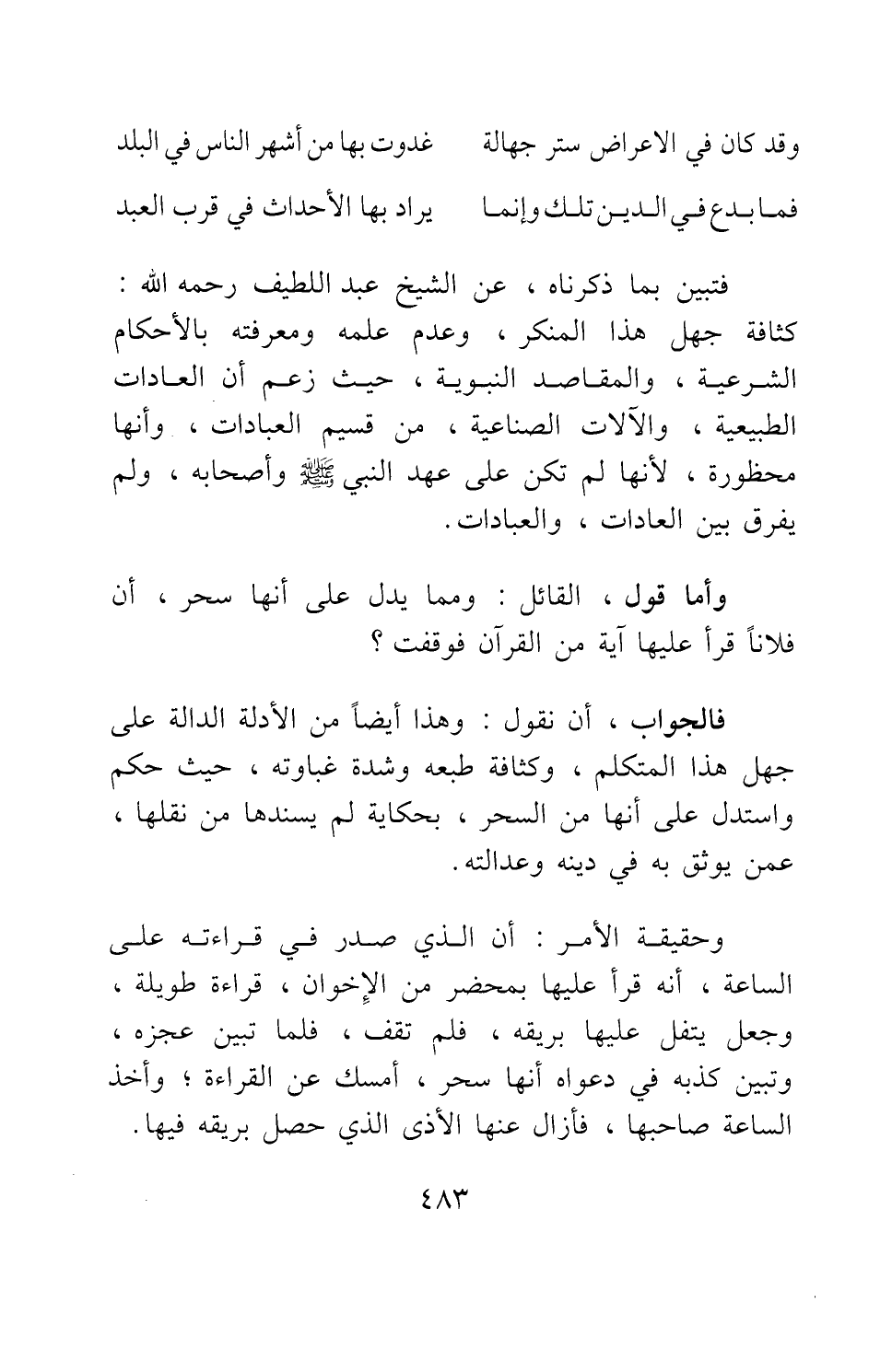 فتبين بما ذكرناه، عن الشيخ عبد اللطيف رحمه الله: كثافة جهل هذا المنكر، وعدم علمه ومعرفته بالأحكام الشرعية والمقاصد النبوية، حيث زعم أن العادات الطبيعية والآلات الصناعية، من قسيم العبادات، وأنها محظورة، لأنها لم تكن على عهد النبي صلى الله عليه وسلم وأصحابه، ولم يفرق بين العادات، والعبادات.