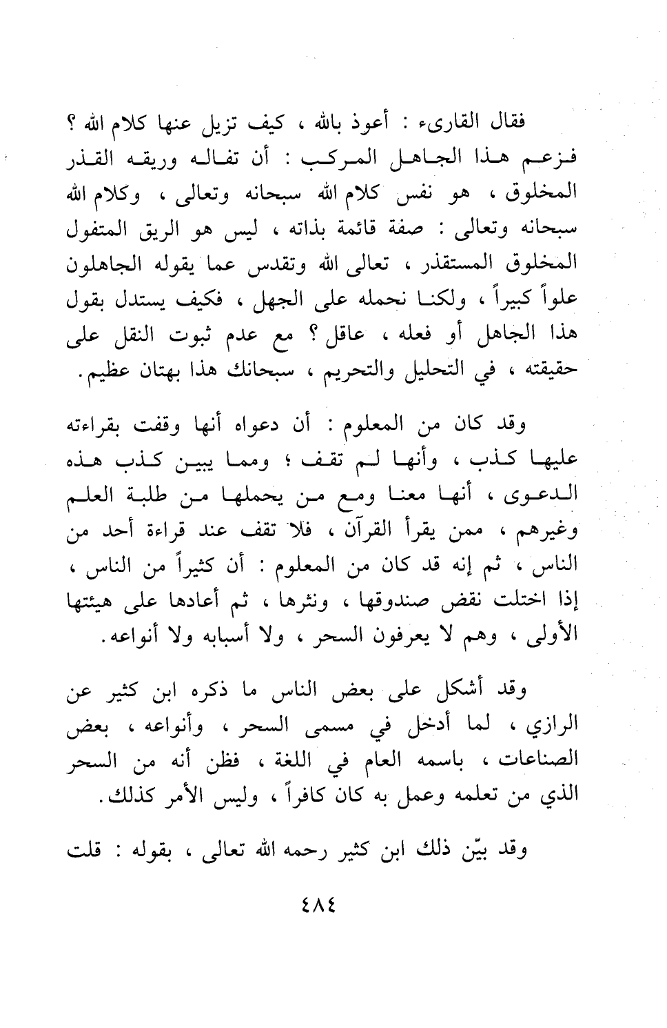 وقد كان من المعلوم أن دعواه أنها وقفت بقراءته عليها كذب، وأنها لم تقف; ومما يبين كذب هذه الدعوى، أنها معنا ومع من يحملها من طلبة العلم وغيرهم، ممن يقرأ القرآن، فلا تقف عند قراءة أحد من الناس. ثم إنه قد كان من المعلوم أن كثيرا من الناس، إذا اختلت نقض صندوقها، ونثرها، ثم أعادها على هيئتها الأولى، وهم لا يعرفون السحر، ولا أسبابه ولا أنواعه. وقد أشكل على بعض الناس ما ذكره ابن كثير عن الرازي، لما أدخل في مسمى السحر، وأنواعه، بعض الصناعات، باسمه العام في اللغة، فظن أنه من السحر الذي من تعلمه وعمل به كان كافرا، وليس الأمر كذلك.