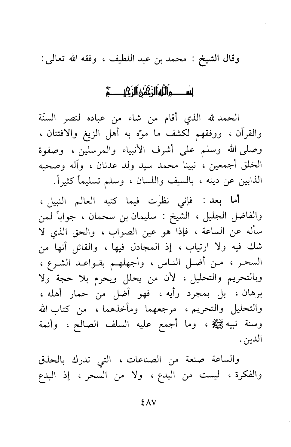 أما بعد: فإني نظرت فيما كتبه العالم النبيل، والفاضل الجليل، الشيخ سليمان بن سحمان، جوابا لمن سأله عن الساعة، فإذا هو عين الصواب، والحق الذي لا شك فيه ولا ارتياب؛ إذ المجادل فيها، والقائل أنها من السحر، من أضل الناس، وأجهلهم بقواعد الشرع، وبالتحريم والتحليل، لأن من يحلل ويحرم بلا حجة ولا برهان، بل بمجرد رأيه، فهو أضل من حمار أهله. والتحليل والتحريم، مرجعهما ومأخذهما، من كتاب الله وسنّة نبيه صلى الله عليه وسلم وما أجمع عليه السلف الصالح، وأئمة الدين.