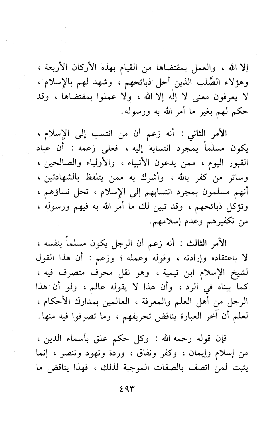 الأمر الثالث: أنه زعم أن الرجل يكون مسلما بنفسه، لا باعتقاده وإرادته، وقوله وعمله; وزعم: أن هذا القول لشيخ الإسلام ابن تيمية، وهو نقل محرف متصرف فيه، كما بيناه في الرد، وأن هذا لا يقوله عالم؛ ولو أن هذا الرجل من أهل العلم والمعرفة، العالمين بمدارك الأحكام، لعلم أن آخر العبارة يناقض تحريفهم، وما تصرفوا فيه منها.