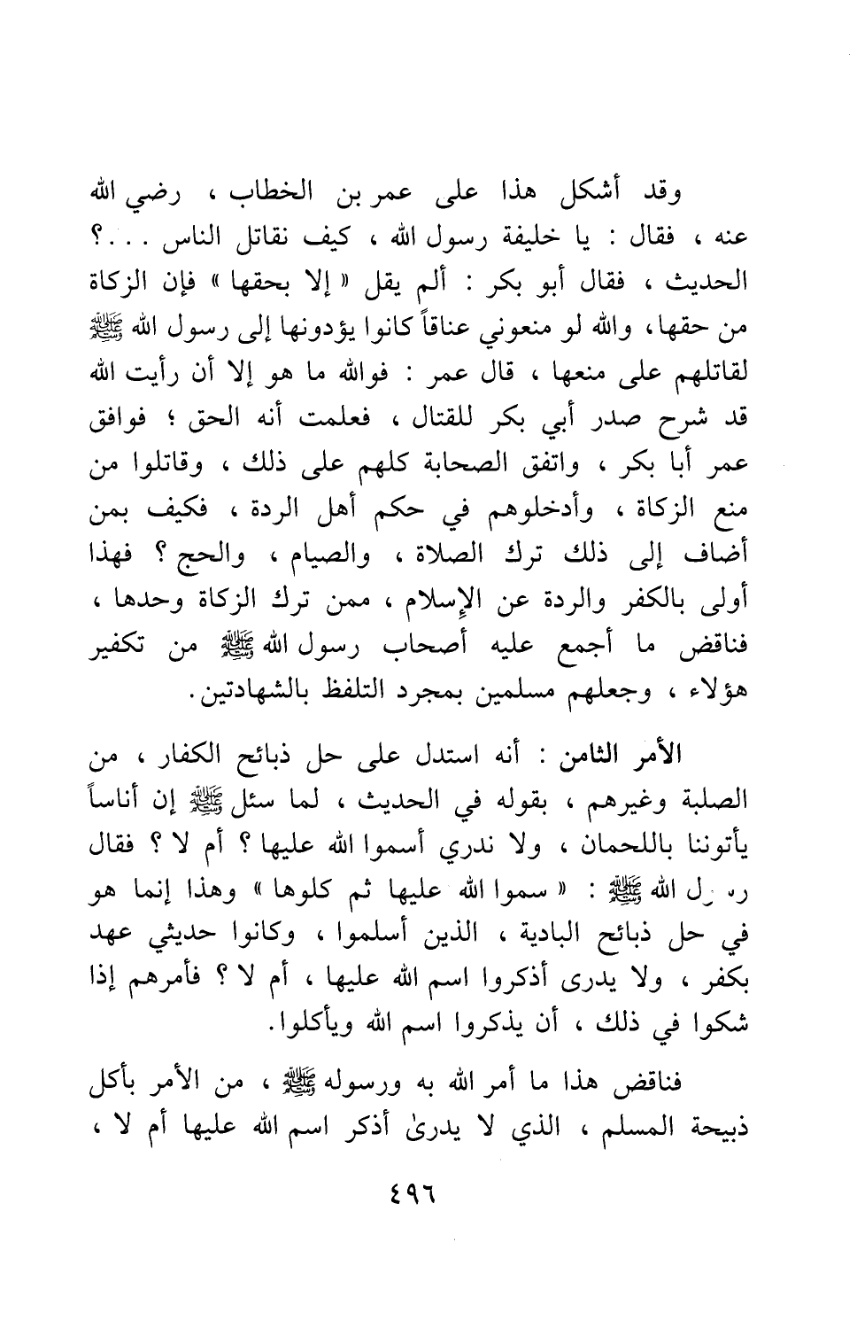 وقد أشكل هذا على عمر بن الخطاب رضي الله عنه، فقال: يا خليفة رسول الله، كيف نقاتل الناس ... ؟ الحديث، فقال أبو بكر:? "ألم يقل إلا بحقها؟ فإن الزكاة من حقها، والله لو منعوني عناقا كانوا يؤدونها إلى رسول الله صلى الله عليه وسلم لقاتلهم. على منعها، قال عمر: فوالله ما هو إلا أن رأيت الله قد شرح صدر أبي بكر للقتال، فعلمت أنه الحق"، فوافق عمر أبا بكر، واتفق الصحابة كلهم على ذلك، وقاتلوا من منع الزكاة، وأدخلوهم في حكم أهل الردة، فكيف بمن أضاف إلى ذلك ترك الصلاة، والصيام، والحج؟ فهذا أولى بالكفر والردة عن الإسلام، ممن ترك الزكاة وحدها، فناقض ما أجمع عليه أصحاب رسول الله صلى الله عليه وسلم من تكفير هؤلاء، وجعلهم مسلمين بمجرد التلفظ بالشهادتين.