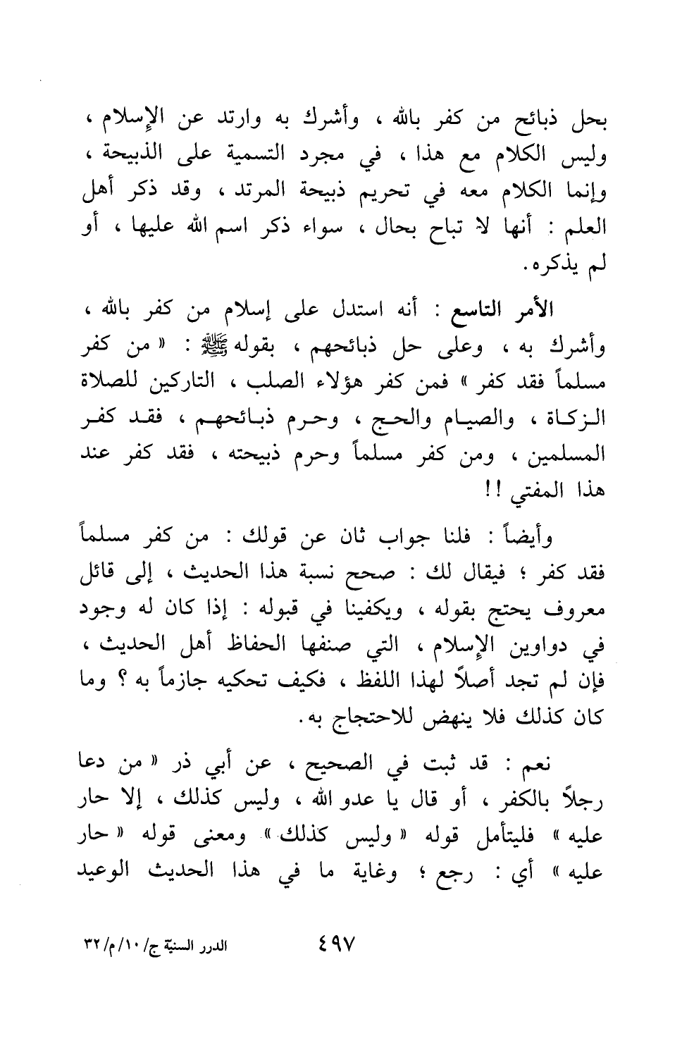 الأمر التاسع: أنه استدل على إسلام من كفر بالله، وأشرك به، وعلى حل ذبائحهم، بقوله صلى الله عليه وسلم:" من كفر مسلما فقد كفر "، فمن كفر هؤلاء الصلب، التاركين للصلاة والزكاة، والصيام والحج، وحرم ذبائحهم، فقد كفر المسلمين، ومن كفر مسلما وحرم ذبيحته، فقد كفر عند هذا المفتي!!