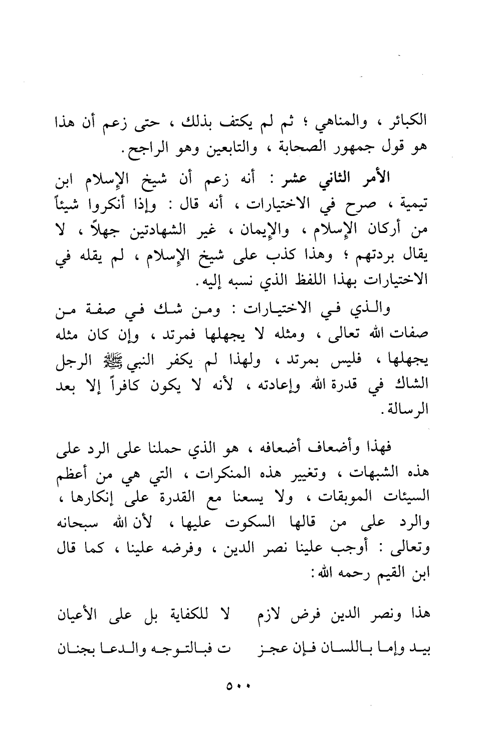 الأمر الثاني عشر: أنه زعم أن شيخ الإسلام ابن تيمية، صرح في الاختيارات، أنه قال: واذا أنكروا شيئا من أركان الإسلام، والإيمان، غير الشهادتين جهلا، لا يقال بردتهم; وهذا كذب على شيخ الإسلام، لم يقله في الاختيارات بهذا اللفظ الذي نسبه إليه.