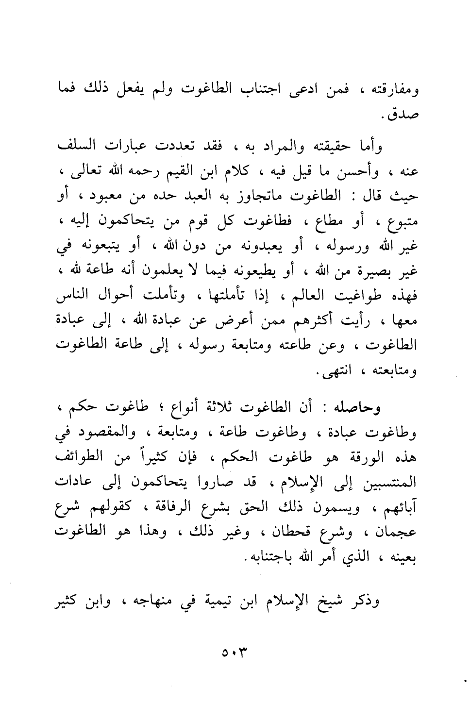 وحاصله: أن الطاغوت ثلاثة أنواع: طاغوت حكم، وطاغوت عبادة، وطاغوت طاعة ومتابعة؛ والمقصود في هذه الورقة هو طاغوت الحكم، فإن كثيرا من الطوائف المنتسبين إلى الإسلام، قد صاروا يتحاكمون إلى عادات آبائهم، ويسمون ذلك الحق بشرع الرفاقة، كقولهم شرع عجمان، وشرع قحطان، وغير ذلك، وهذا هو الطاغوت بعينه، الذي أمر الله باجتنابه.