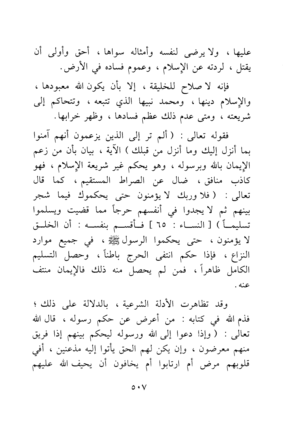 فقوله تعالى: {أَلَمْ تَرَ إِلَى الَّذِينَ يَزْعُمُونَ أَنَّهُمْ آمَنُوا بِمَا أُنْزِلَ إِلَيْكَ وَمَا أُنْزِلَ مِنْ قَبْلِكَ} 1 الآية، بيان بأن من زعم الإيمان بالله وبرسوله، وهو يحكم غير شريعة الإسلام، فهو كاذب منافق، ضال عن الصراط المستقيم، كما قال تعالى: {فَلا وَرَبِّكَ لا يُؤْمِنُونَ حَتَّى يُحَكِّمُوكَ فِيمَا شَجَرَ بَيْنَهُمْ ثُمَّ لا يَجِدُوا فِي أَنْفُسِهِمْ حَرَجاً مِمَّا قَضَيْتَ وَيُسَلِّمُوا تَسْلِيماً} 2، فأقسم بنفسه: أن الخلق لا يؤمنون، حتى يحكموا الرسول صلى الله عليه وسلم في جميع موارد النِّزاع؛ فإذا حكم انتفى الحرج باطنا، وحصل التسليم الكامل ظاهرا؛ فمن لم يحصل منه ذلك فالإيمان منتف عنه.