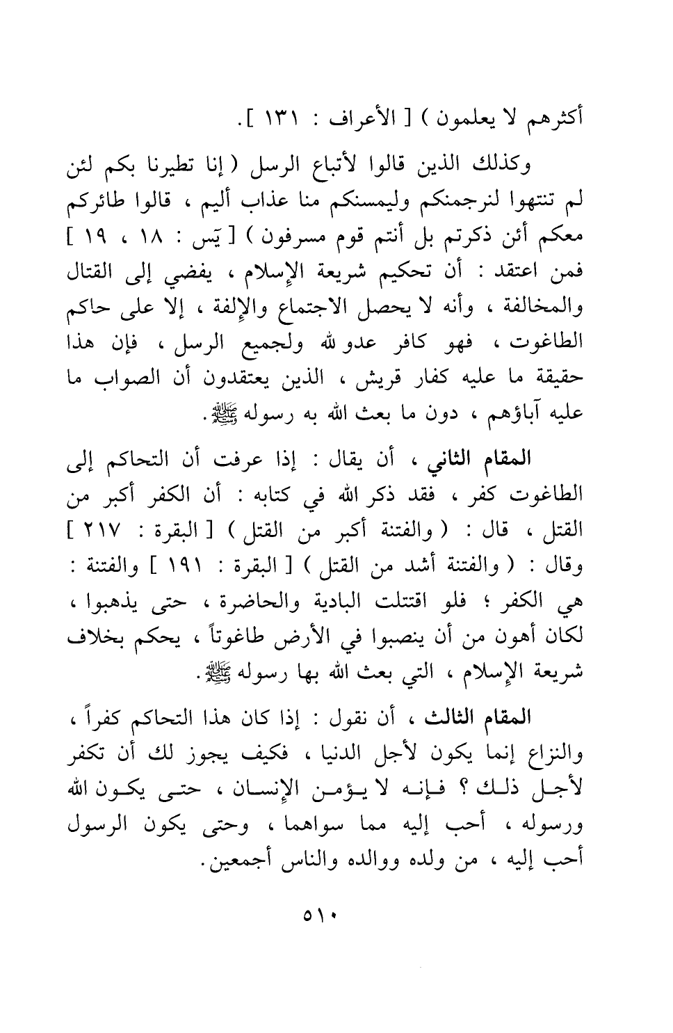 المقام الثاني: أن يقال: إذا عرفت أن التحاكم إلى الطاغوت كفر، فقد ذكر الله في كتابه أن الكفر أكبر من القتل، قال: {وَالْفِتْنَةُ أَكْبَرُ مِنَ الْقَتْلِ} 3، وقال: {وَالْفِتْنَةُ أَشَدُّ مِنَ الْقَتْلِ} 4، والفتنة: هي الكفر; فلو اقتتلت البادية والحاضرة، حتى يذهبوا، لكان أهون من أن ينصبوا في الأرض طاغوتا، يحكم بخلاف شريعة الإسلام، التي بعث الله بها رسوله صلى الله عليه وسلم.
