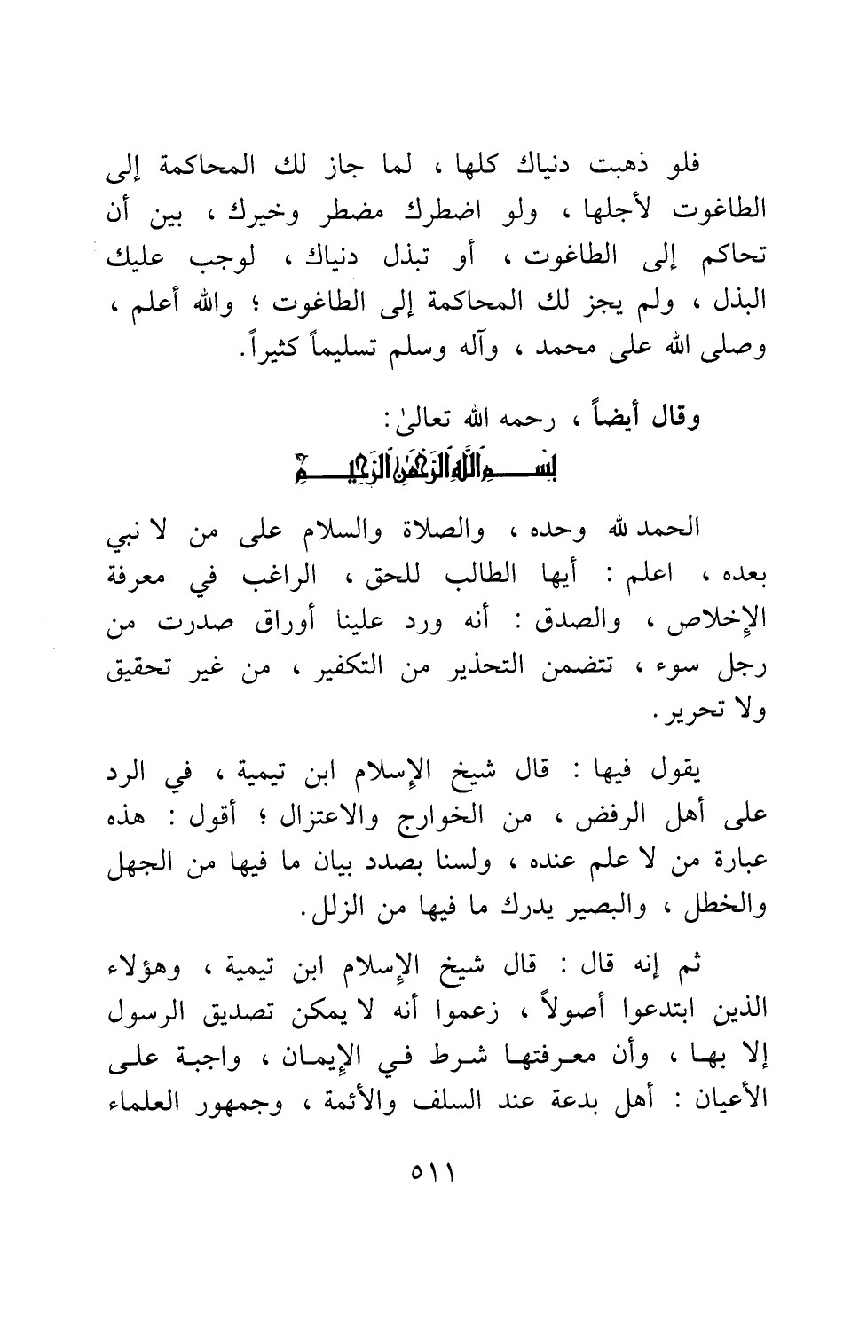 الحمد لله وحده، والصلاة والسلام على من لا نبي بعده، اعلم: أيها الطالب للحق، الراغب في معرفة الإخلاص والصدق، أنه ورد علينا أوراق صدرت من رجل سوء، تتضمن التحذير من التكفير، من غير تحقيق ولا تحرير.