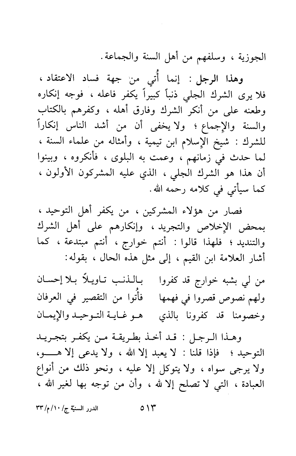 وهذا الرجل إنما أُتي من جهة فساد الاعتقاد، فلا يرى الشرك الجلي ذنبا كبيرا يكفر فاعله، فوجه إنكاره وطعنه على من أنكر الشرك وفارق أهله، وكفرهم بالكتاب والسنة والإجماع; ولا يخفى أن من أشد الناس إنكارا للشرك: شيخ الإسلام ابن تيمية، وأمثاله من علماء السنة، لما حدث في زمانهم، وعمت به البلوى، فأنكروه، وبينوا أن هذا هو الشرك الجلي، الذي عليه المشركون الأولون، كما سيأتي في كلامه رحمه الله. فصار من هؤلاء المشركين، من يكفر أهل التوحيد، بمحض الإخلاص والتجريد، وإنكارهم على أهل الشرك والتنديد; فلهذا قالوا: أنتم خوارج، أنتم مبتدعة، كما أشار العلامة ابن القيم، إلى مثل هذه الحال، بقوله: