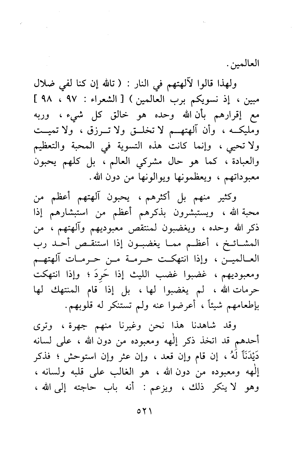 ولهذا قالوا لآلهتهم في النار: {تَاللَّهِ إِنْ كُنَّا لَفِي ضَلالٍ مُبِينٍ إِذْ نُسَوِّيكُمْ بِرَبِّ الْعَالَمِينَ} 1، مع إقرارهم بأن الله وحده هو خالق كل شيء، وربه ومليكه، وأن آلهتهم لا تخلق ولا ترزق، ولا تميت ولا تحيي؛ وإنما كانت هذه التسوية في المحبة والتعظيم والعبادة، كما هو حال مشركي العالم، بل كلهم يحبون معبوداتهم، ويعظمونها ويوالونها من دون الله. وكثير منهم بل أكثرهم، يحبون آلهتهم أعظم من محبة الله، ويستبشرون بذكرهم أعظم من استبشارهم إذا ذكر الله وحده، ويغضبون لمنتقص معبوديهم وآلهتهم من المشايخ، أعظم مما يغضبون إذا استنقص أحد رب العالمين، وإذا انتهكت حرمة من حرمات آلهتهم ومعبوديهم، غضبوا غضب الليث إذا حَرِدَ; وإذا انتهكت حرمات الله، لم يغضبوا لها، بل إذا قام المنتهك لها بإطعامهم شيئا، أعرضوا عنه ولم تستنكر له قلوبهم.