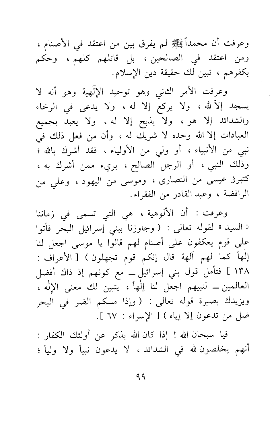 وعرفت أن الألوهية، هي التي تسمى في زماننا "السيد"، لقوله تعالى: {وَجَاوَزْنَا بِبَنِي إِسْرائيلَ الْبَحْرَ فَأَتَوْا عَلَى قَوْمٍ يَعْكُفُونَ عَلَى أَصْنَامٍ لَهُمْ قَالُوا يَا مُوسَى اجْعَلْ لَنَا إِلَهاً كَمَا لَهُمْ آلِهَةٌ قَالَ إِنَّكُمْ قَوْمٌ تَجْهَلُونَ} 1.فتأمل قول بني إسرائيل - مع كونهم إذ ذاك أفضل العالمين – لنبيهم: اجعل لنا إلها، يتبين لك معنى الإله، ويزيدك بصيرة قوله تعالى: {وَإِذَا مَسَّكُمُ الضُّرُّ فِي الْبَحْرِ ضَلَّ مَنْ تَدْعُونَ إِلَّا إِيَّاهُ} 2.