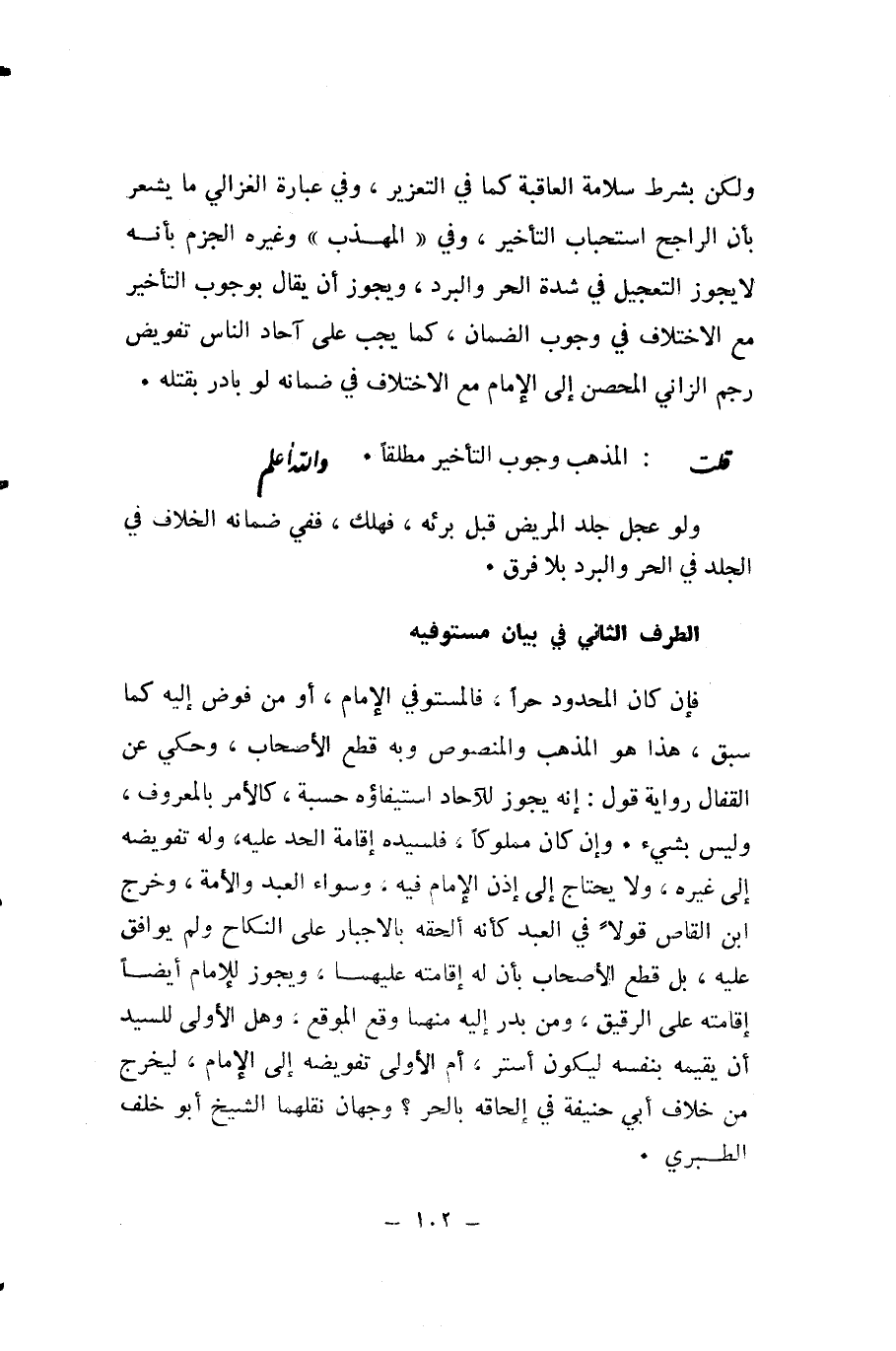 وَلَكِنْ بِشَرْطِ سَلَامَةِ الْعَاقِبَةِ كَمَا فِي التَّعْزِيرِ، وَفِي عِبَارَةِ الْغَزَالِيِّ مَا يُشْعِرُ بِأَنَّ الرَّاجِحَ اسْتِحْبَابُ التَّأْخِيرِ، وَفِي «الْمُهَذَّبِ» وَغَيْرِهِ الْجَزْمُ بِأَنَّهُ لَا يَجُوزُ التَّعْجِيلُ فِي شِدَّةِ الْحَرِّ وَالْبَرْدِ، وَيَجُوزُ أَنْ يُقَالَ بِوُجُوبِ التَّأْخِيرِ مَعَ الِاخْتِلَافِ فِي وُجُوبِ الضَّمَانِ، كَمَا يَجِبُ عَلَى آحَادِ النَّاسِ تَفْوِيضُ رَجْمِ الزَّانِي الْمُحْصَنِ إِلَى الْإِمَامِ مَعَ الِاخْتِلَافِ فِي ضَمَانِهِ لَوْ بَادَرَ بِقَتْلِهِ.