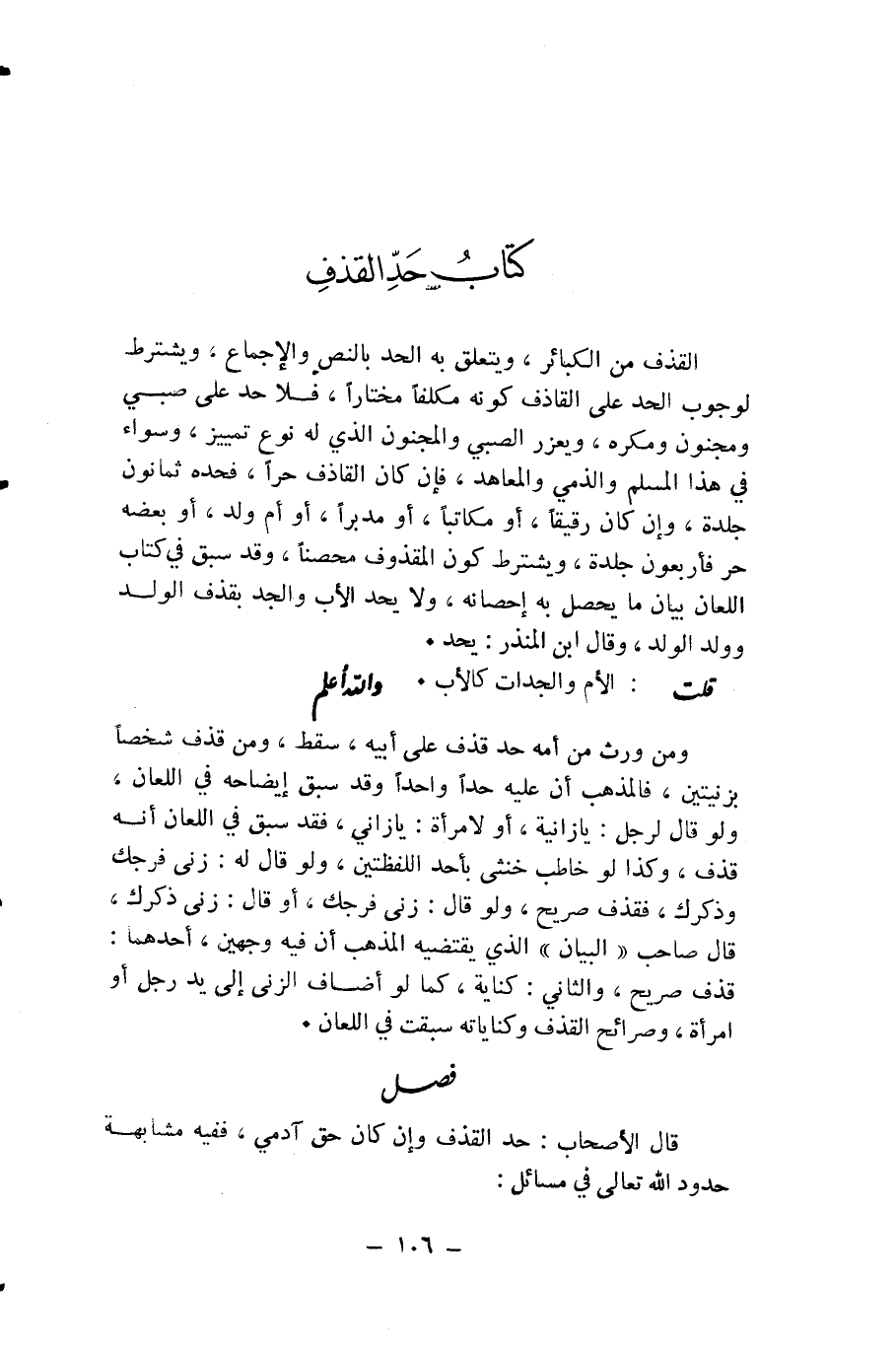 الْقَذْفُ مِنَ الْكَبَائِرِ، وَيَتَعَلَّقُ بِهِ الْحَدُّ بِالنَّصِّ وَالْإِجْمَاعِ. وَيُشْتَرَطُ لِوُجُوبِ الْحَدِّ عَلَى الْقَاذِفِ كَوْنُهُ مُكَلَّفًا مُخْتَارًا، فَلَا حَدَّ عَلَى صَبِيٍّ وَمَجْنُونٍ وَمُكْرَهٍ، وَيُعَزَّرُ الصَّبِيُّ وَالْمَجْنُونُ الَّذِي لَهُ نَوْعُ تَمْيِيزٍ، وَسَوَاءٌ فِي هَذَا الْمُسْلِمُ وَالذِّمِّيُّ وَالْمُعَاهَدُ، فَإِنْ كَانَ الْقَاذِفُ حُرًّا، فَحَدُّهُ ثَمَانُونَ جَلْدَةً، وَإِنْ كَانَ رَقِيقًا، أَوْ مُكَاتَبًا، أَوْ مُدَبَّرًا، أَوْ أُمَّ وَلَدٍ، أَوْ بَعْضُهُ حُرٌّ فَأَرْبَعُونَ جَلْدَةً، وَيُشْتَرَطُ كَوْنُ الْمَقْذُوفِ مُحْصَنًا، وَقَدْ سَبَقَ فِي كِتَابِ اللِّعَانِ بَيَانُ مَا يَحْصُلُ بِهِ إِحْصَانُهُ، وَلَا يُحَدُّ الْأَبُ وَالْجَدُّ بِقَذْفِ الْوَلَدِ وَوَلَدِ الْوَلَدِ، وَقَالَ ابْنُ الْمُنْذِرِ: يُحَدُّ.
