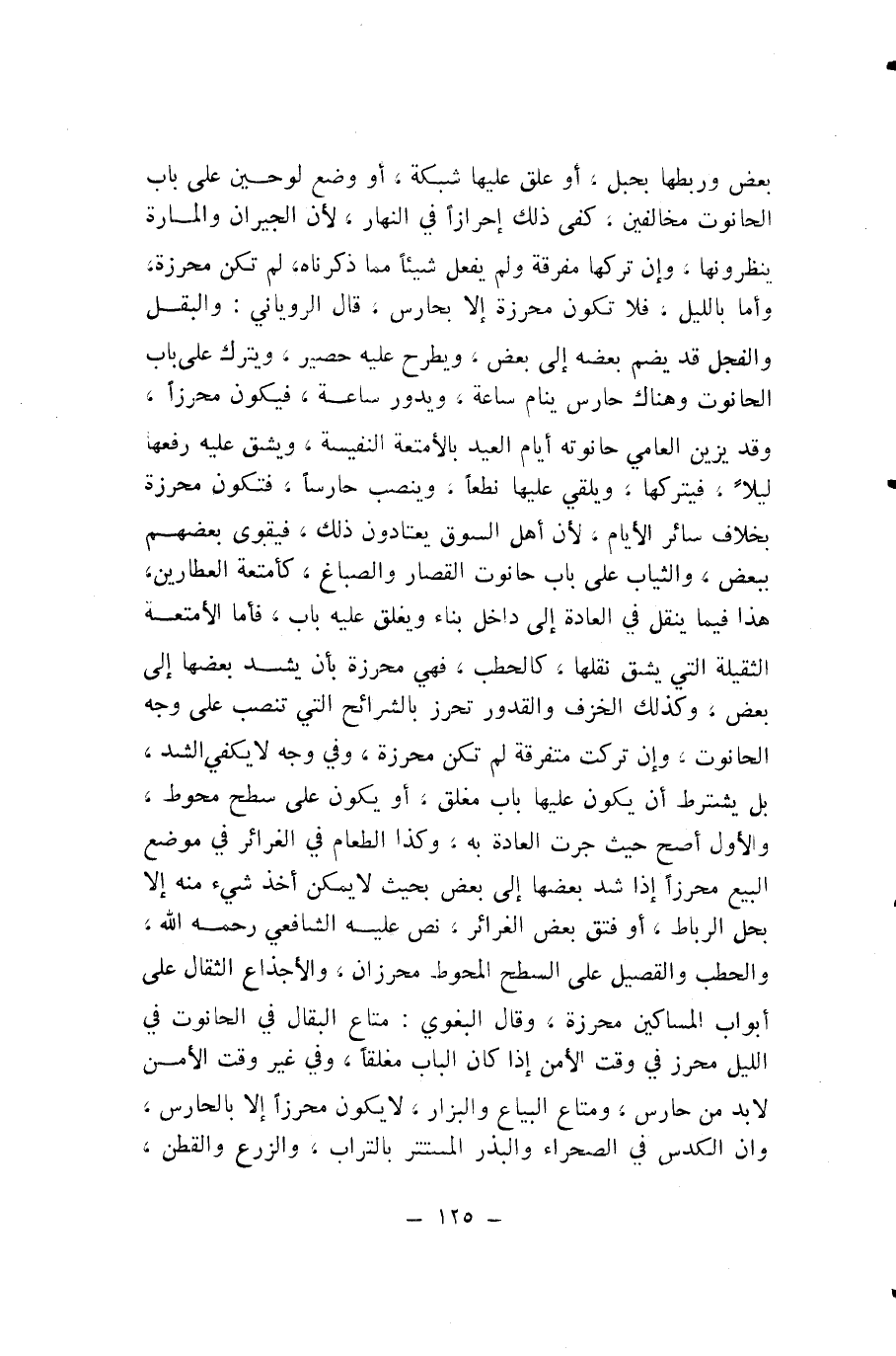 قَالَ الرُّويَانِيُّ: وَالْبَقْلُ وَالْفُجْلُ قَدْ يُضَمُّ بَعْضُهُ إِلَى بَعْضٍ، وَيُطْرَحُ عَلَيْهِ حَصِيرٌ، وَيُتْرَكُ عَلَى بَابِ الْحَانُوتِ وَهُنَاكَ حَارِسٌ يَنَامُ سَاعَةً وَيَدُورُ سَاعَةً، فَيَكُونُ مُحْرَزًا، وَقَدْ يُزَيِّنُ الْعَامِّيُّ حَانُوتَهُ أَيَّامَ الْعِيدِ بِالْأَمْتِعَةِ النَّفِيسَةِ، وَيُشَقُّ عَلَيْهِ رَفْعُهَا لَيْلًا، فَيَتْرُكُهَا، وَيَلْقِي عَلَيْهَا نَطْعًا، وَيُنَصِّبُ حَارِسًا، فَتَكُونُ مُحْرَزَةً بِخِلَافِ سَائِرِ الْأَيَّامِ ; لِأَنَّ أَهْلَ السُّوقِ يَعْتَادُونَ ذَلِكَ، فَيَقْوَى بَعْضُهُمْ بِبَعْضٍ، وَالثِّيَابُ عَلَى بَابِ حَانُوتِ الْقَصَّارِ وَالصَّبَّاغِ، كَأَمْتِعَةِ الْعَطَّارِينَ، هَذَا فِيمَا يُنْقَلُ فِي الْعَادَةِ إِلَى دَاخِلِ بِنَاءٍ وَيُغْلَقُ عَلَيْهِ بَابٌ، فَأَمَّا الْأَمْتِعَةُ الثَّقِيلَةُ الَّتِي يُشَقُّ نَقْلُهَا، كَالْحَطَبِ، فَهِيَ مُحْرَزَةٌ بِأَنْ يُشَدَّ بَعْضُهَا إِلَى بَعْضٍ، وَكَذَلِكَ الْخَزَفُ وَالْقُدُورُ تُحْرَزُ بِالشَّرَائِحِ الَّتِي تَنْصَبُّ عَلَى وَجْهِ الْحَانُوتِ، وَإِنْ تُرِكَتْ مُتَفَرِّقَةً لَمْ تَكُنْ مُحْرَزَةً، وَفِي وَجْهٍ لَا يَكْفِي الشَّدُّ، بَلْ يُشْتَرَطُ أَنْ يَكُونَ عَلَيْهَا بَابٌ مُغْلَقٌ، أَوْ يَكُونُ عَلَى سَطْحٍ مَحُوطٍ، وَالْأَوَّلُ أَصَحُّ حَيْثُ جَرَتِ الْعَادَةُ بِهِ، وَكَذَا الطَّعَامُ فِي الْغَرَائِرِ فِي مَوْضِعِ الْبَيْعِ مُحْرَزًا إِذَا شُدَّ بَعْضُهَا إِلَى بَعْضٍ بِحَيْثُ لَا يُمْكِنُ أَخْذُ شَيْءٍ مِنْهُ إِلَّا بِحَلِّ الرِّبَاطِ، أَوْ فَتْقِ بَعْضِ الْغَرَائِرِ، نَصَّ عَلَيْهِ الشَّافِعِيُّ رَحِمَهُ اللَّهُ، وَالْحَطَبُ وَالْقَصِيلُ عَلَى السَّطْحِ الْمَحُوطِ مُحْرَزَانِ، وَالْأَجْذَاعُ الثِّقَالُ عَلَى أَبْوَابِ الْمَسَاكِينِ مُحْرَزَةٌ، وَقَالَ الْبَغَوِيُّ: مَتَاعُ الْبَقَّالِ فِي الْحَانُوتِ فِي اللَّيْلِ مُحْرَزٌ فِي وَقْتِ الْأَمْنِ إِذَا كَانَ الْبَابُ مُغْلَقًا، وَفِي غَيْرِ وَقْتِ الْأَمْنِ لَا بُدَّ مِنْ حَارِسٍ، وَمَتَاعُ الْبَيَّاعِ وَالْبَزَّارِ، لَا يَكُونُ مُحْرَزًا إِلَّا بِالْحَارِسِ، وَإِنَّ الْكَدْسَ فِي الصَّحْرَاءِ وَالْبَذْرَ الْمُسْتَتِرَ بِالتُّرَابِ، وَالزَّرْعَ وَالْقُطْنَ،