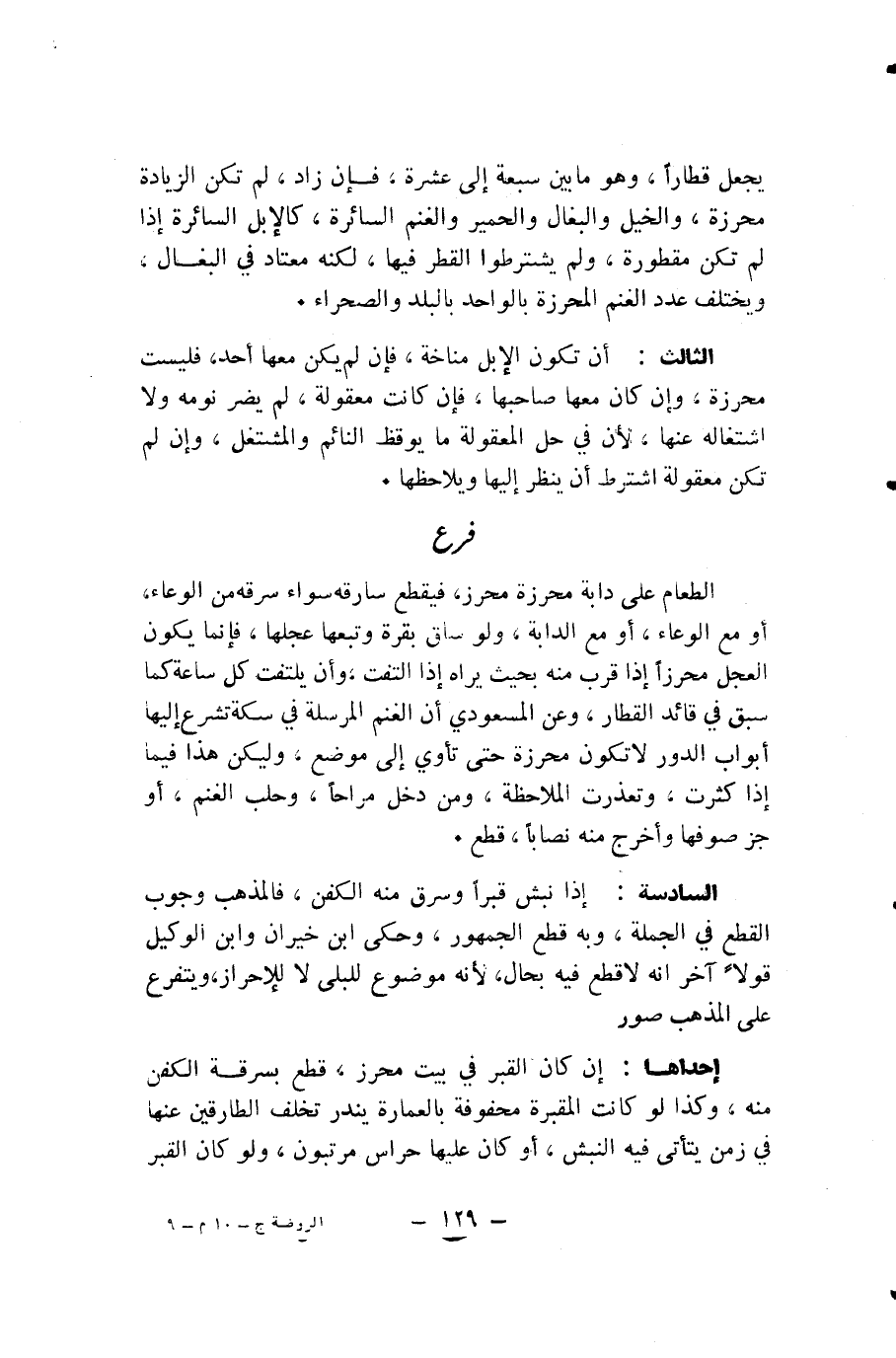 الطَّعَامُ عَلَى دَابَّةٍ مُحْرَزَةٍ مُحْرَزٌ، فَيُقْطَعُ سَارِقُهُ سَوَاءً مِنَ الْوِعَاءِ، أَوْ مَعَ الْوِعَاءِ، أَوْ مَعَ الدَّابَّةِ، وَلَوْ سَاقَ بَقَرَةً وَتَبِعَهَا عِجْلُهَا، فَإِنَّمَا يَكُونُ الْعِجَلُ مُحْرَزًا إِذَا قَرُبَ مِنْهُ بِحَيْثُ يَرَاهُ إِذَا الْتَفَتَ، وَأَنْ يَلْتَفِتَ كُلَّ سَاعَةٍ كَمَا سَبَقَ فِي قَائِدِ الْقِطَارِ، وَعَنِ الْمَسْعُودِيِّ أَنَّ الْغَنَمَ الْمُرْسَلَةَ فِي سِكَّةٍ تُشْرَعُ إِلَيْهَا أَبْوَابُ الدَّوْرِ لَا تَكُونُ مُحْرَزَةً حَتَّى تَأْوِيَ إِلَى مَوْضِعٍ، وَلْيَكُنْ هَذَا فِيمَا إِذَا كَثُرَتْ، وَتَعَذَّرَتِ الْمُلَاحَظَةُ، وَمَنْ دَخَلَ مَرَاحًا، وَحَلَبَ الْغَنَمَ، أَوْ جَزَّ صُوفَهَا وَأَخْرَجَ مِنْهُ نِصَابًا، قَطْعٌ.
